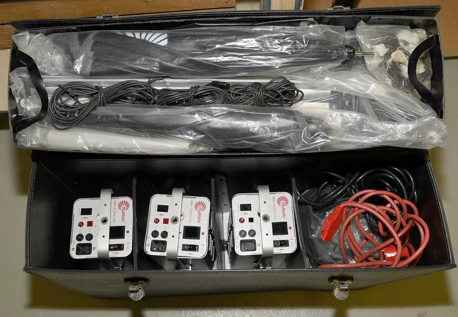 Das Multiblitz Mini-Studio 202 ist ein tragbares Blitzstudio-Kit für Fotografie. Es umfasst drei Hochleistungsblitzgeräte, einen Koffer für den Transport und diverses Zubehör.
