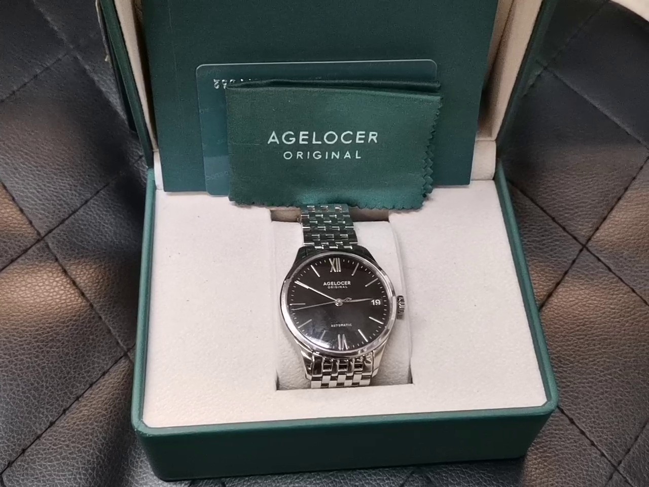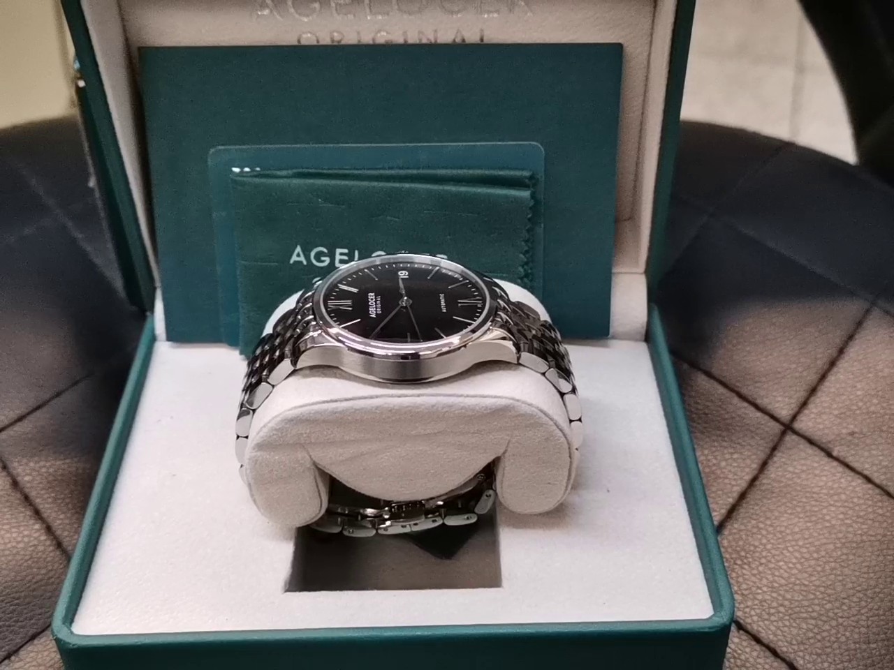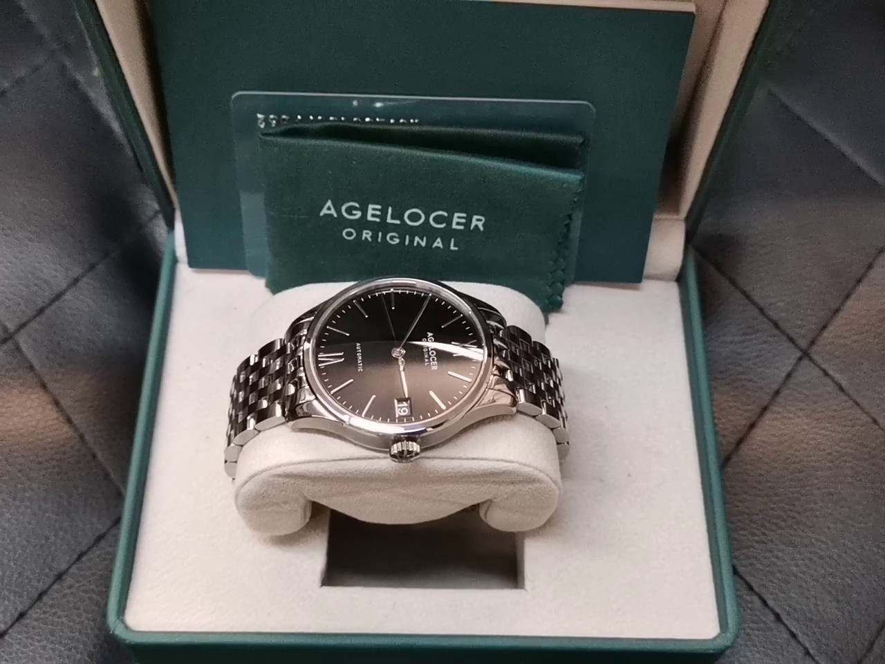 Elegante Herrenarmbanduhr von Agelocer mit automatischem Präzisionsuhrwerk. Das Modell präsentiert sich in einem robusten Stahlgehäuse und verfügt über ein tiefschwarzes Zifferblatt, das durch klassische römische Ziffern und eine praktische Datumsanzeige akzentuiert wird. Die Uhr wird originalverpackt (OVP) mit Box geliefert und vereint traditionelles Design mit moderner Uhrmacherkunst.