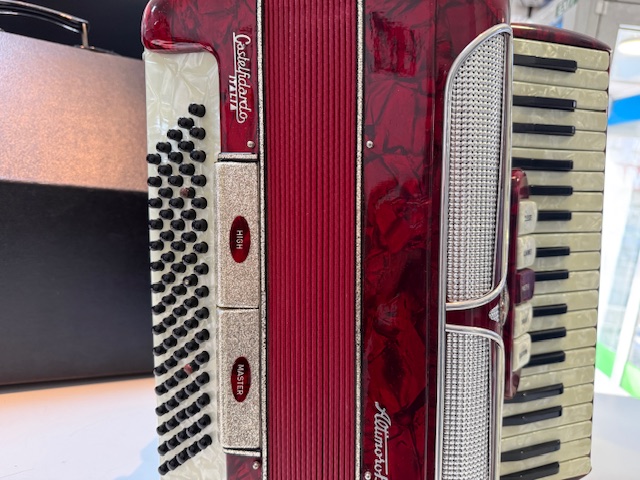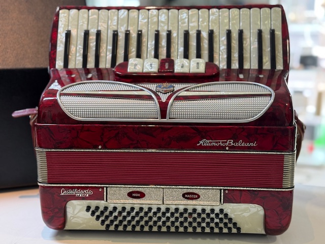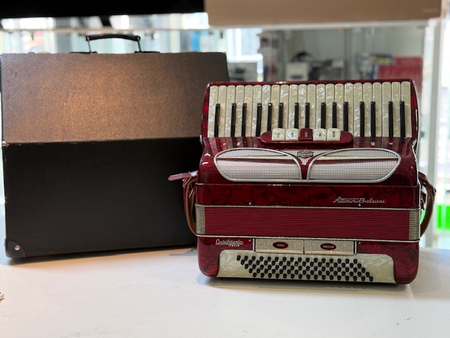 Das Altimoro Baleani Akkordeon mit 80 Bässen ist ein Instrument, das typischerweise in Italien, oft in Castelfidardo, hergestellt wurde. Es handelt sich um ein Pianoakkordeon, das sich durch seine kompaktere Bassseite im Vergleich zu 120-Bass-Modellen auszeichnet und sich daher gut für Spieler eignet, die eine geringere Größe bevorzugen. Modelle dieser Marke und Bauart sind bekannt dafür, verschiedene Registeroptionen für den Diskant zu bieten, um eine klangliche Vielfalt zu ermöglichen.