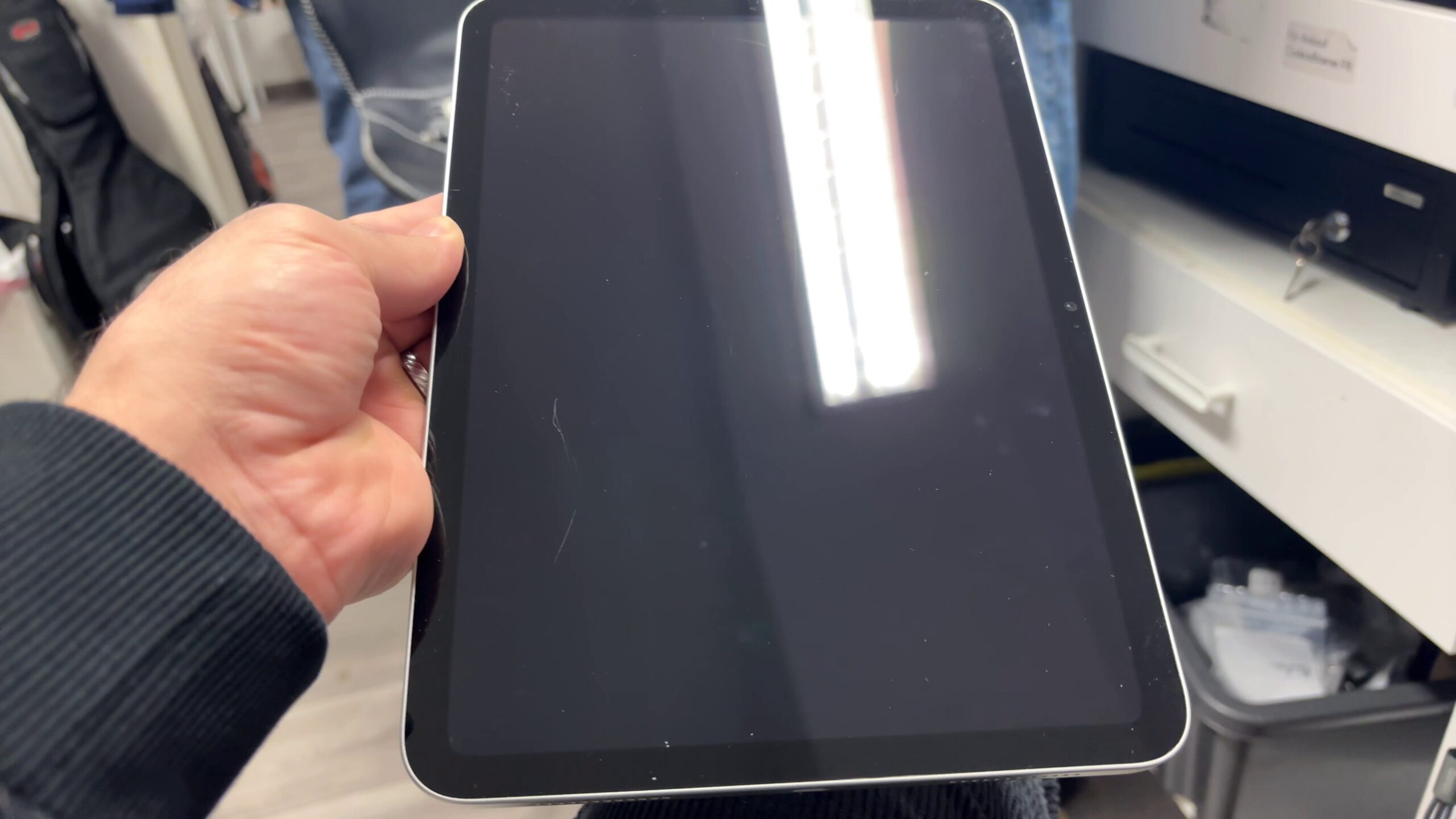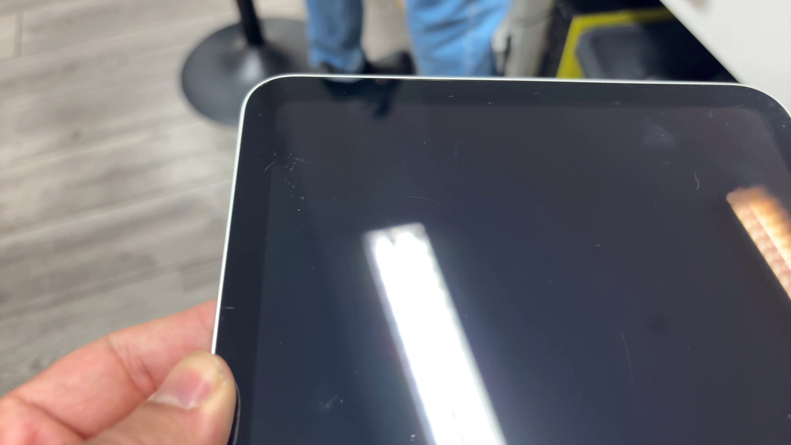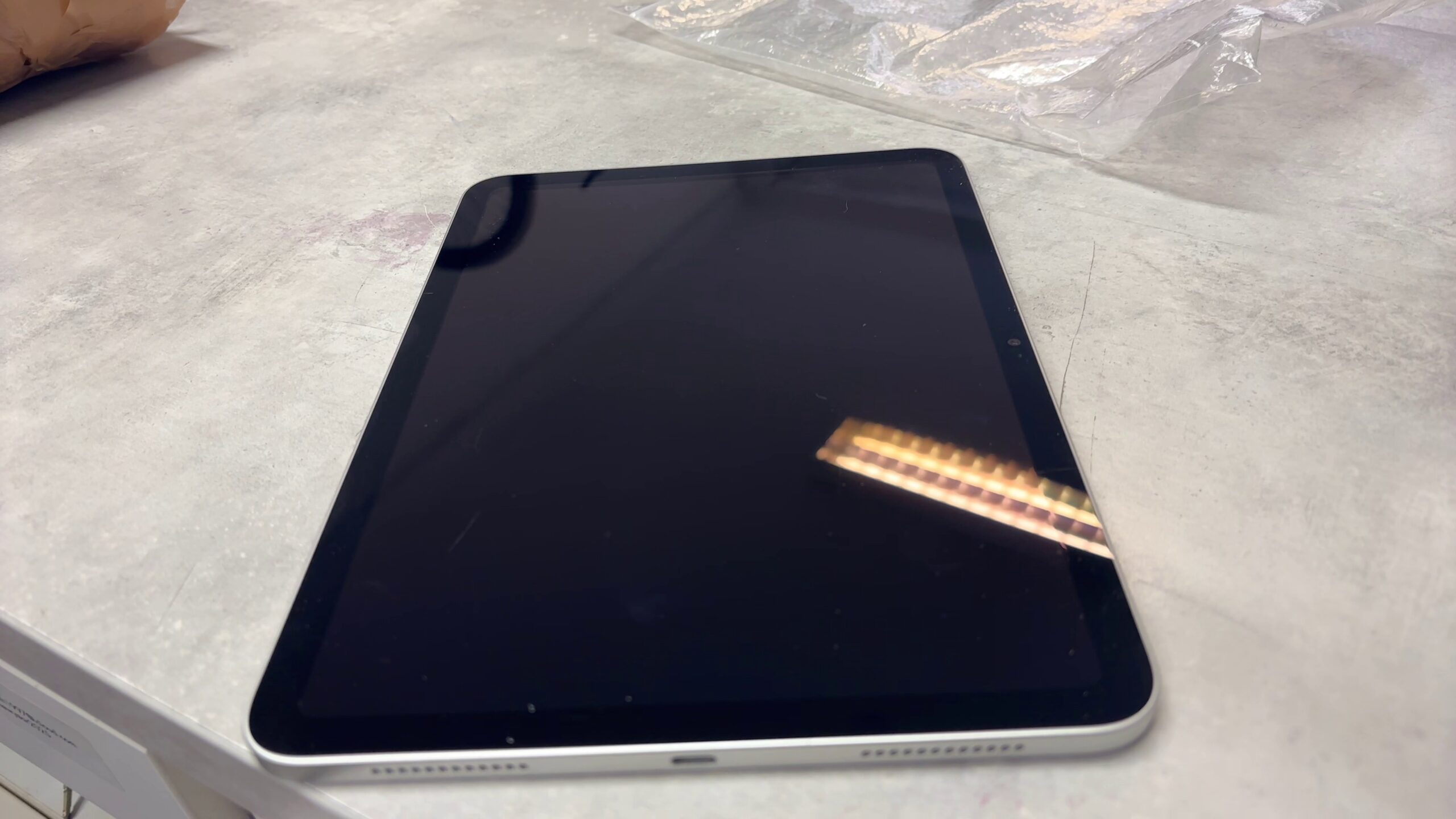 Gebrauchtes Apple iPad der 10. Generation mit 64 GB Speicherplatz. Das Gerät weist sichtbare Kratzer auf.