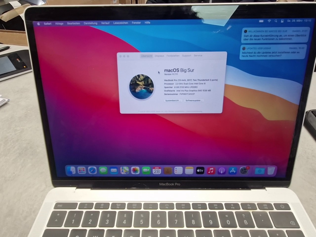 Gebrauchtes Apple MacBook Pro 13 Zoll aus dem Jahr 2017 in Silber mit leichten Gehäusekratzern. Dieses Modell bietet eine solide Leistung für alltägliche Aufgaben und mobiles Arbeiten. Das Gerät wird inklusive passendem Ladekabel und Originalverpackung (OVP) geliefert.