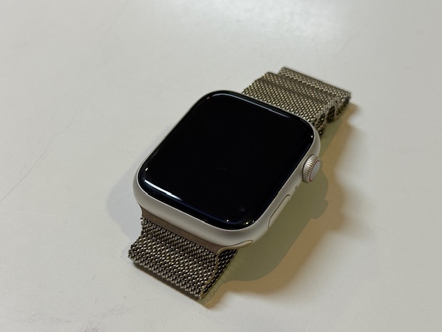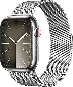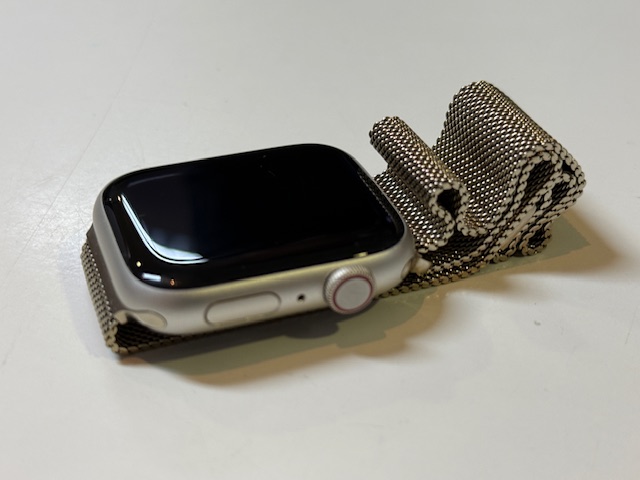 Apple Watch S9 45mm LTE Alu M-Band, Mit Ladekabel, Batterie 100%. Die Bilder zeigen eine silberne | helle Aluminium-Version mit Milanaise-Armband. | Zustand: Sehr Gut