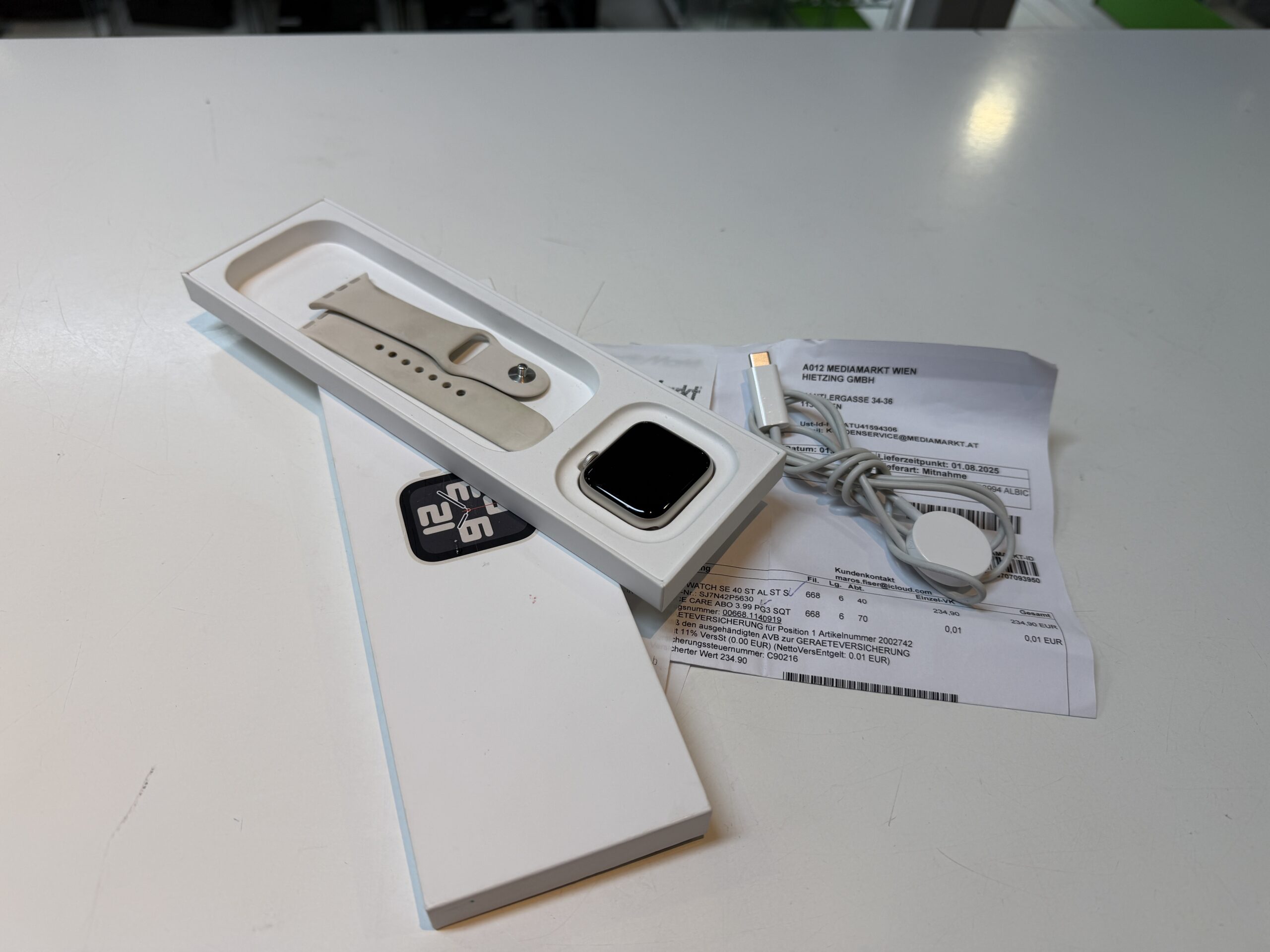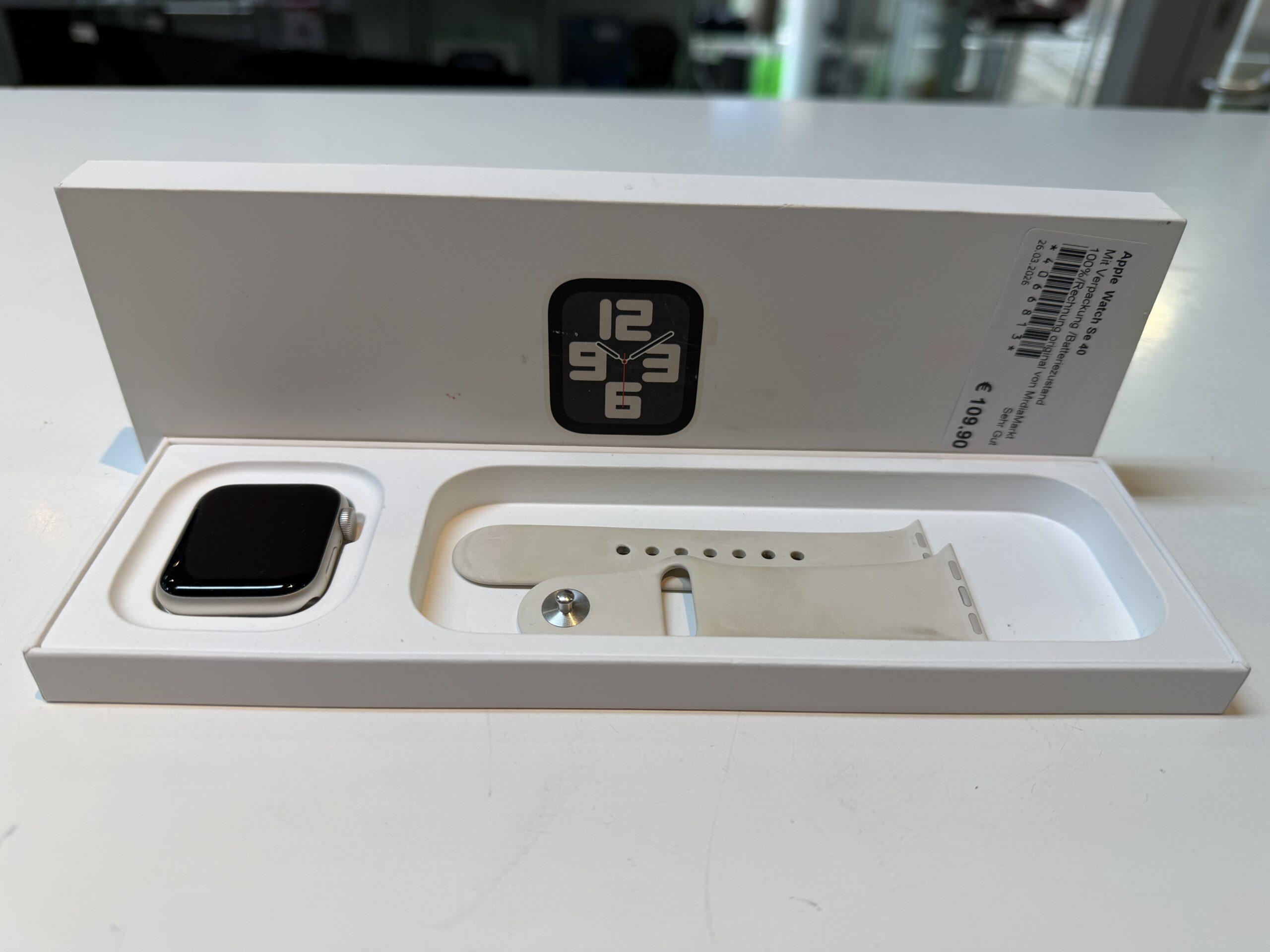 Gebrauchte Apple Watch SE (vermutlich 2. Generation, da neuere Modelle oft mit „SE 3“ bezeichnet werden, aber die Suche liefert Daten für SE und SE 3) mit 40mm Aluminiumgehäuse in Starlight. Die Uhr befindet sich in einem sehr guten Zustand, was durch den Batteriezustand von 100% und die Angabe der Originalverpackung sowie einer Rechnung von MediaMarkt unterstrichen wird.