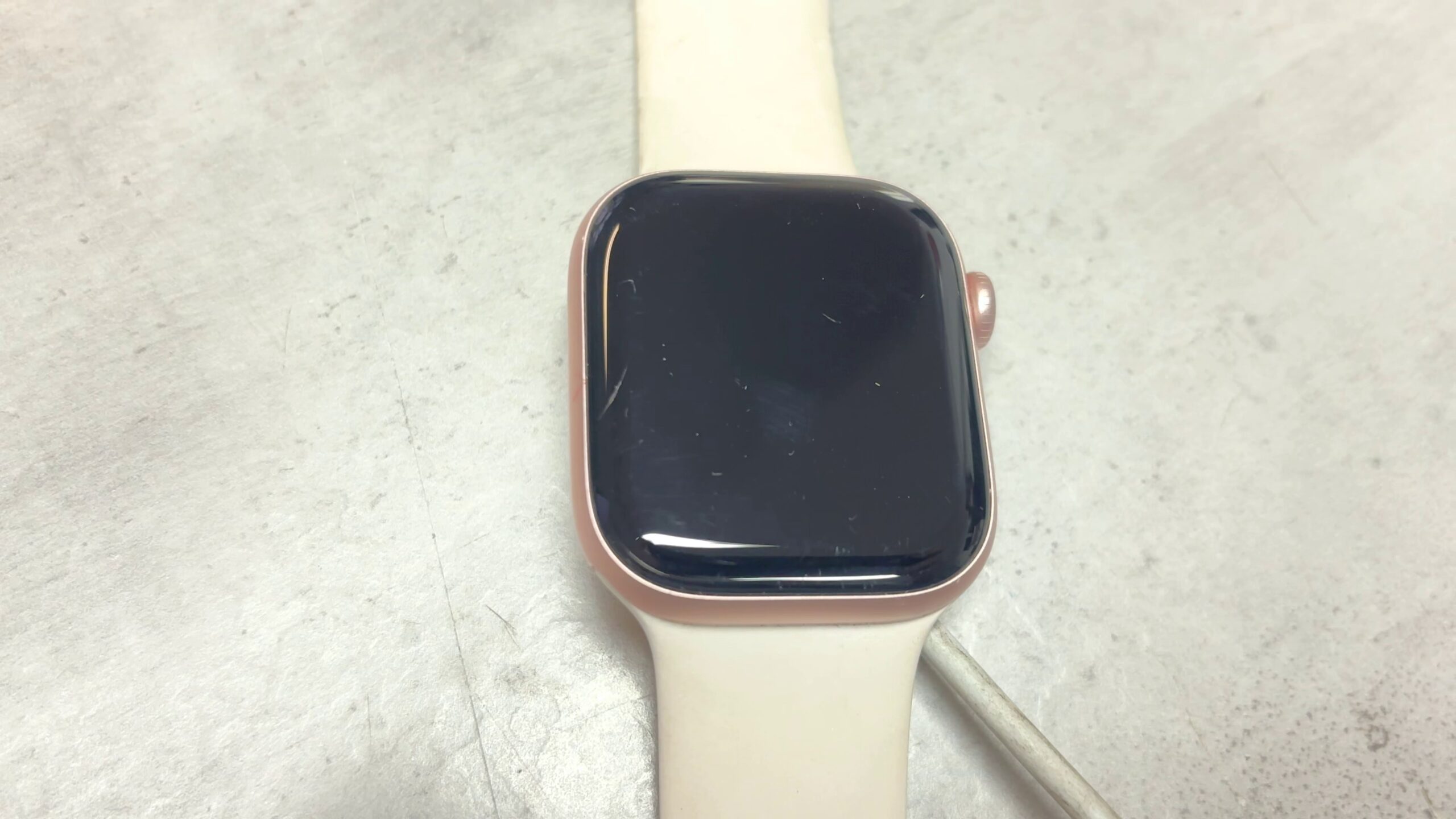Gebrauchte Apple Watch Series 10 mit 42mm Aluminiumgehäuse in Roségold und GPS-Funktion, ausgestattet mit einem Sportarmband. Das Display weist sichtbare Kratzer auf. Die Uhr bietet modernes Design und zuverlässige Funktionen für den Alltag und die Aktivitätsverfolgung.