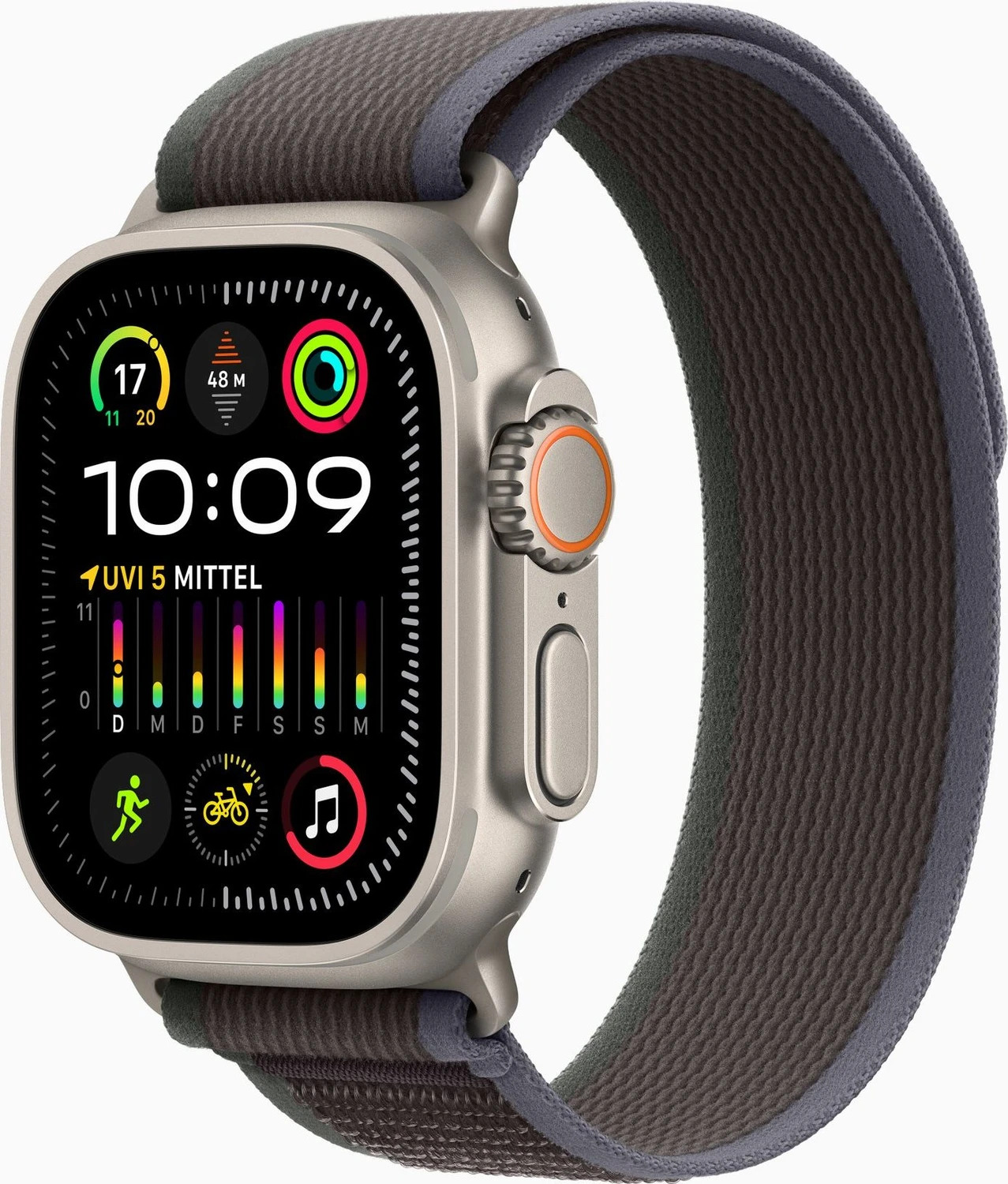 Die Apple Watch Ultra 2 mit Trail Loop Band (Größe M/L) ist Apples robusteste und leistungsfähigste Smartwatch, ideal für Outdoor-Aktivitäten und anspruchsvolle Nutzer. Sie verfügt über das hellste Display aller Zeiten und wird vom neuen, schnelleren S9 SiP Chip angetrieben, der Funktionen wie die Gestensteuerung „Double Tap“ und On-Device-Siri ermöglicht. Die Uhr bietet präzises Dual-Frequenz GPS, erweiterte Funktionen für Wasserabenteuer und umfassendes Gesundheits- sowie Sport-Tracking. Das Gehäuse besteht aus Titan und die Uhr ist in Kombination mit dem Trail Loop eines der ersten klimaneutralen Produkte von Apple.