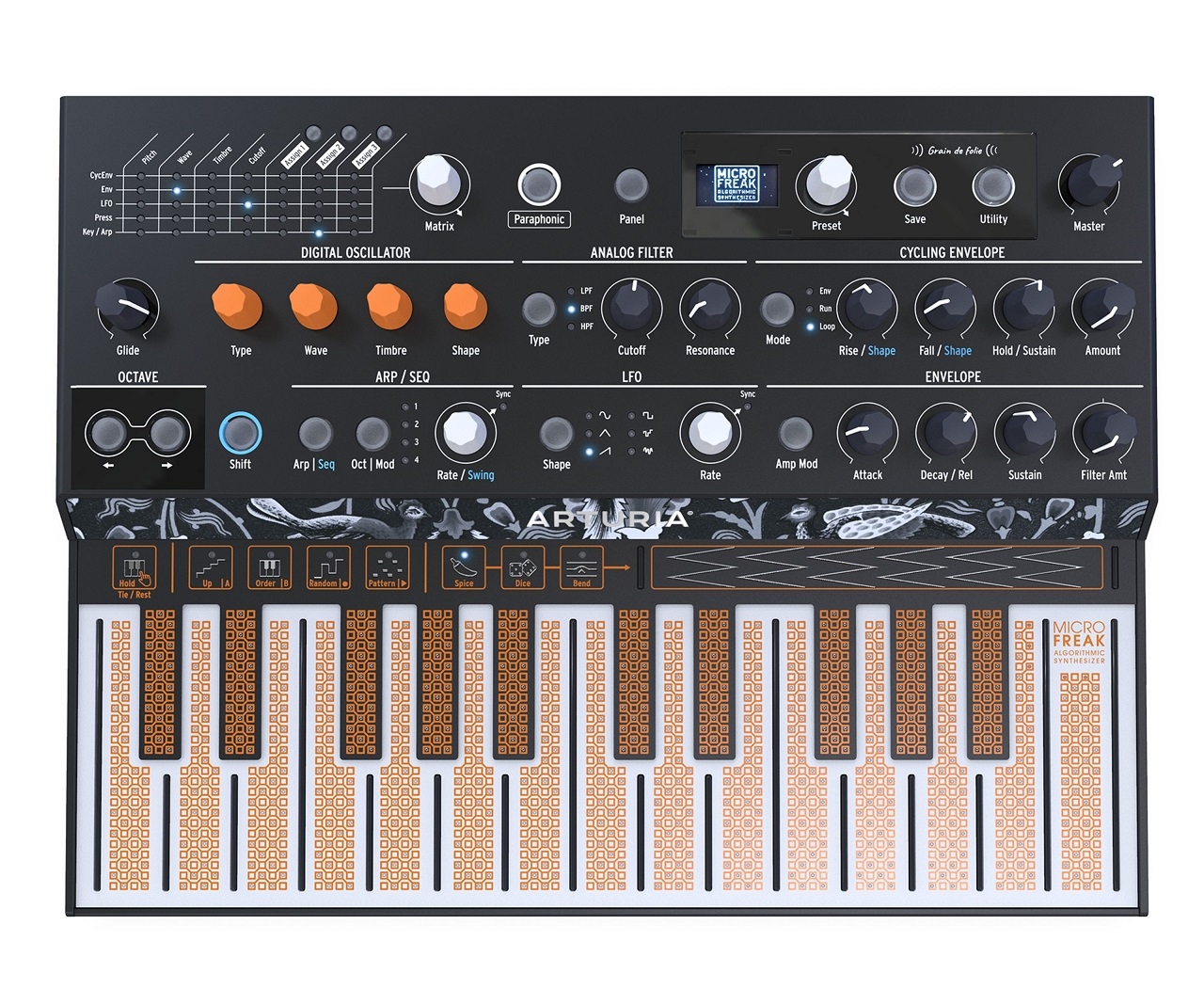Der Arturia MicroFreak ist ein experimenteller Hybrid-Synthesizer, der digitale Oszillatoren mit einem analogen Multimode-Filter kombiniert, um eine außergewöhnliche Klangvielfalt zu ermöglichen. Er verfügt über eine einzigartige kapazitive Tastatur mit Poly-Aftertouch und einen leistungsstarken Arpeggiator sowie einen 64-Step-Sequenzer. Mit 17 verschiedenen Oszillatormodi, darunter Wavetable, Granular-Engines und Vocoder-Optionen (je nach Edition), bietet er tiefgreifende Sounddesign-Möglichkeiten. Die 5×7-Modulationsmatrix erlaubt komplexe Klangmanipulationen.