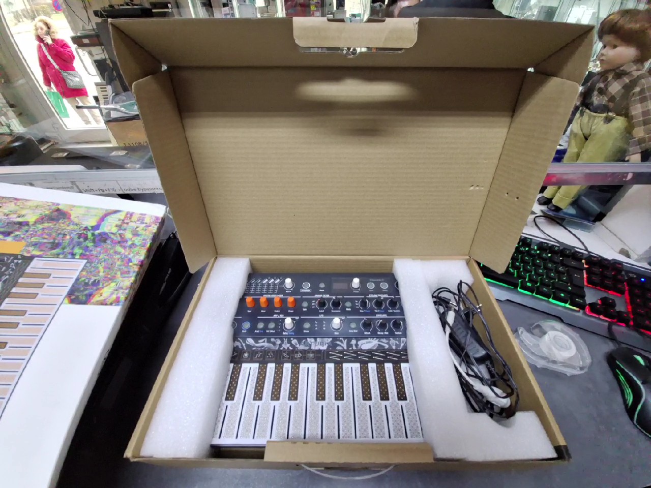 - Anschlüsse: 1x 6,35 mm Master-Out, 1x 3,5 mm Kopfhörer-Out, USB, MIDI In/Out, CV Out, Gate Out, Pressure Out, Clock In/Out