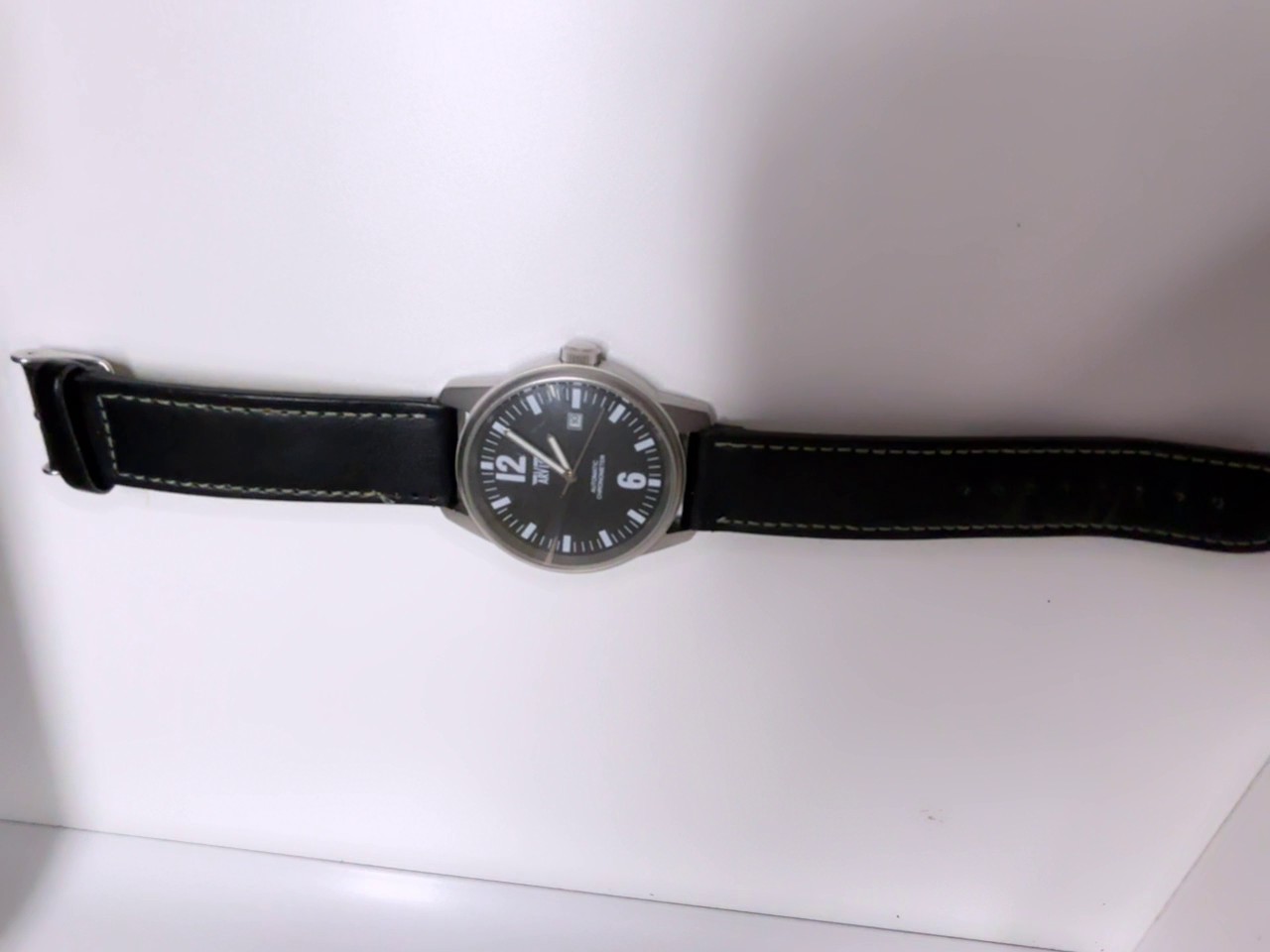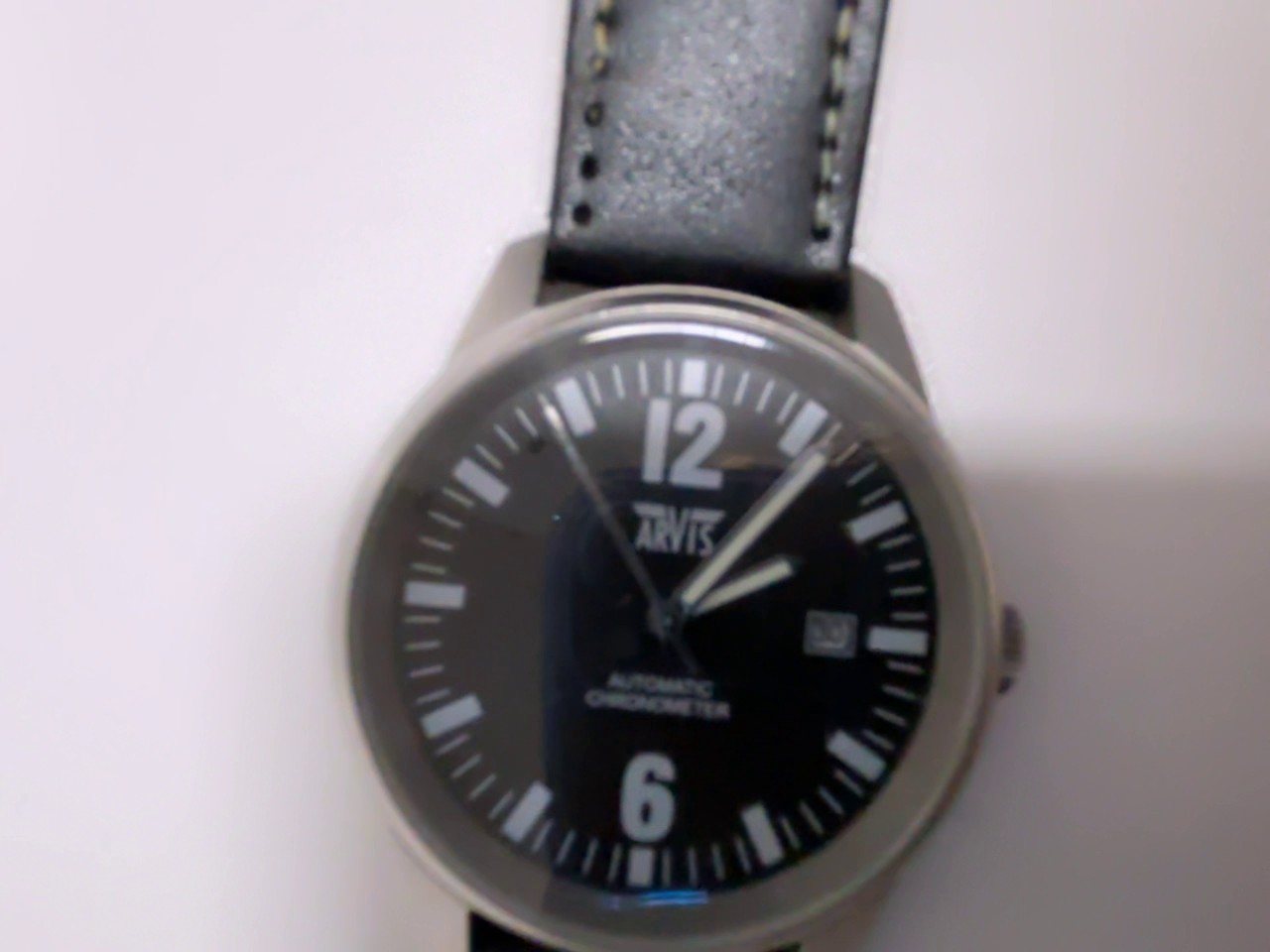 Arvis Automatic Chronometer Herrenuhr mit markantem schwarzem Zifferblatt und zuverlässigem Automatikwerk. Das zeitlose Design wird durch ein schwarzes Lederarmband ergänzt. Ein praktisches Datumsfenster sorgt für zusätzliche Funktionalität. Bitte beachten Sie, dass leichte Kratzer am Gehäuse oder Glas vorhanden sind.