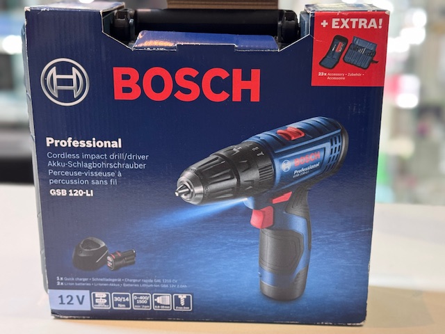 Bosch Professional GSB 120-LI Akku-Schlagbohrschrauber inkl. Koffer + 2 Akkus 2.0Ah + Zubehör, Akku-Schlagbohrschrauber 12V. Inkl. 2x 2.0Ah Akkus, Ladegerät und Werkzeugkoffer. | Zustand: Neu