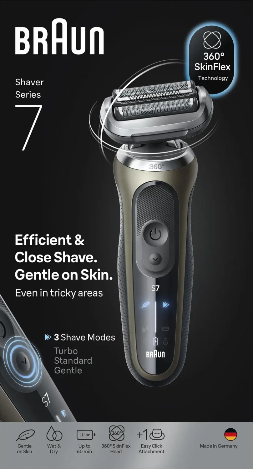 Der Braun Series 7 72-C1200S Wet&Dry Elektrorasierer bietet eine gründlichere und schnellere Rasur als je zuvor und ist dabei sanft zur Haut. Der 360° SkinFlex Kopf passt sich den Konturen an für eine ultra-glatte Rasur, auch in schwierigen Bereichen. Er verfügt über drei verschiedene Rasiermodi (Turbo, Sanft, Standard) zur Personalisierung des Sisherlebnisses. Die Rasierer dieser Serie sind 100% wasserdicht und für die Trocken- und Nassrasur geeignet (mit Schaum, Gel oder unter der Dusche).