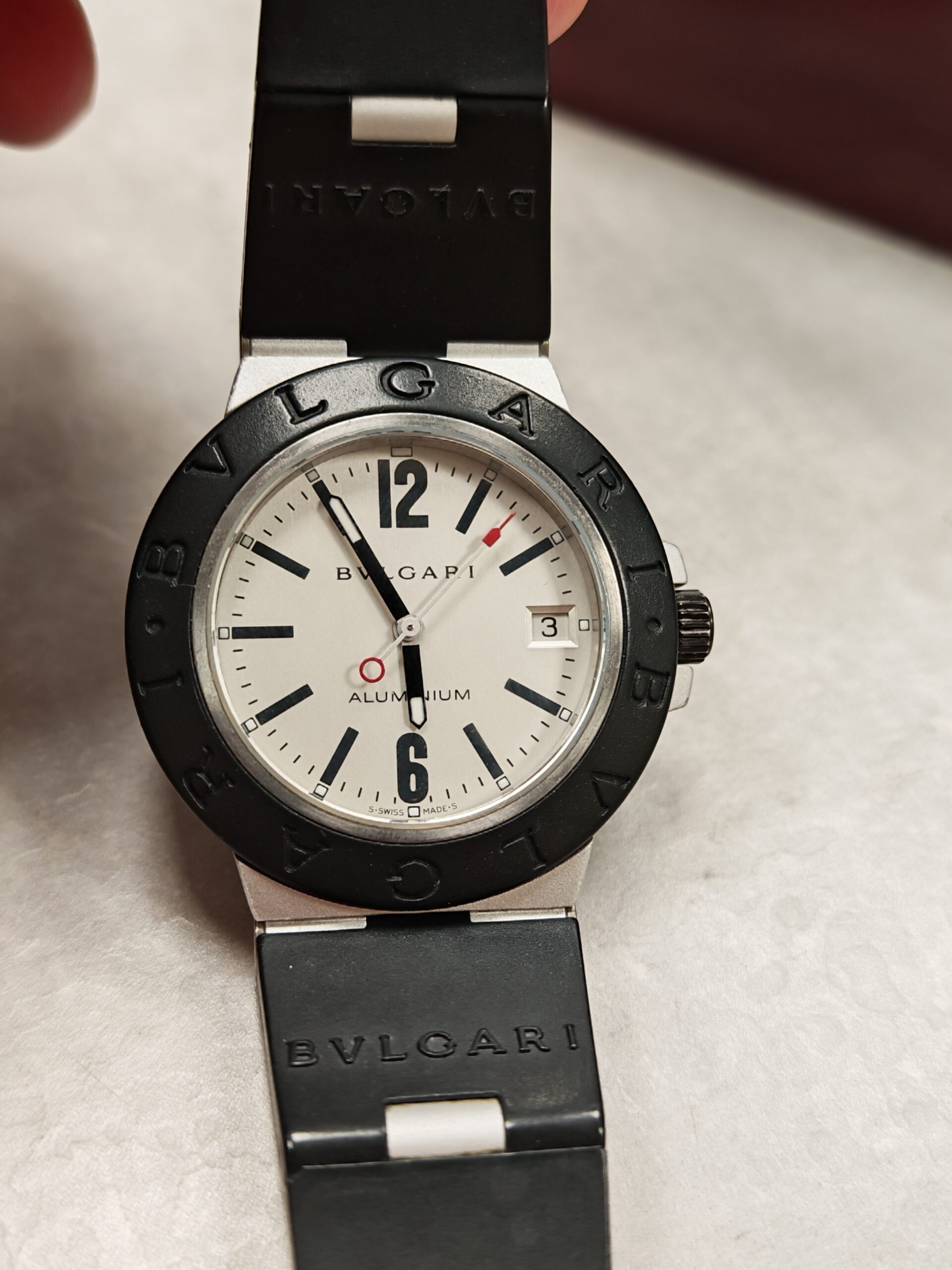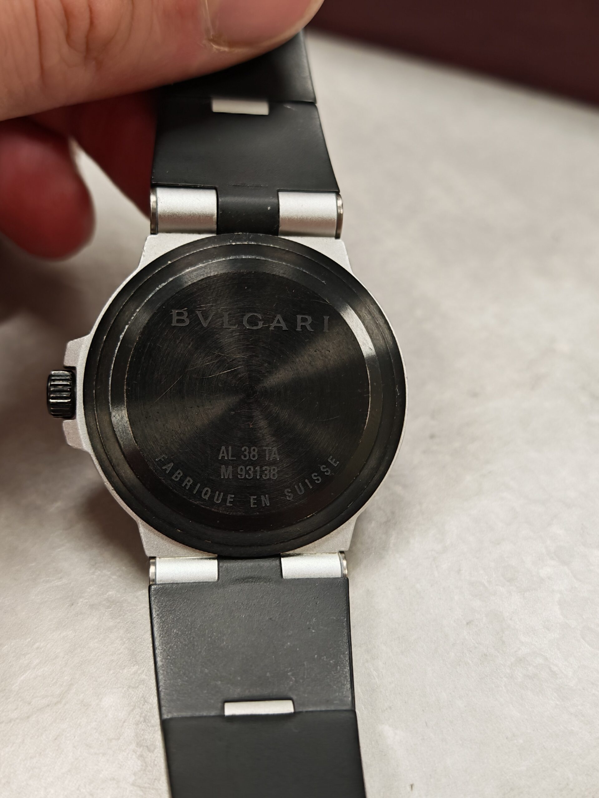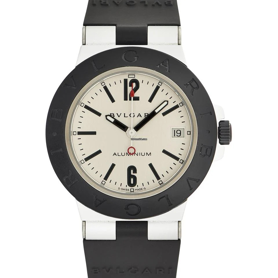 Die Bulgari Diagono AL 38 TA ist eine elegante Herrenarmbanduhr mit einem sportlichen Touch. Das Gehäuse besteht aus leichtem Aluminium mit einer markanten, doppelt gelabelten Gummi-Lünette. Das Zifferblatt ist in Silber gehalten und mit arabischen Ziffern sowie Strichindizes versehen. Eine Datumsanzeige befindet sich bei 3 Uhr. Das Uhrwerk ist ein präzises Automatikwerk.