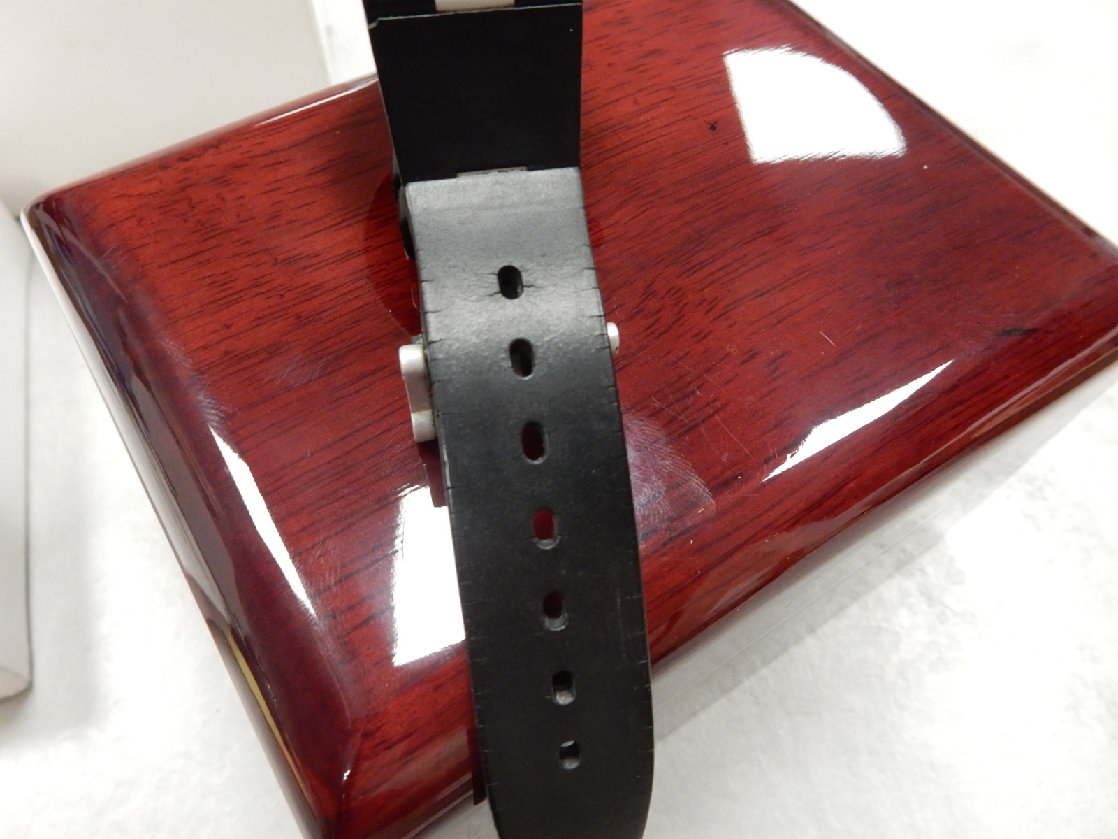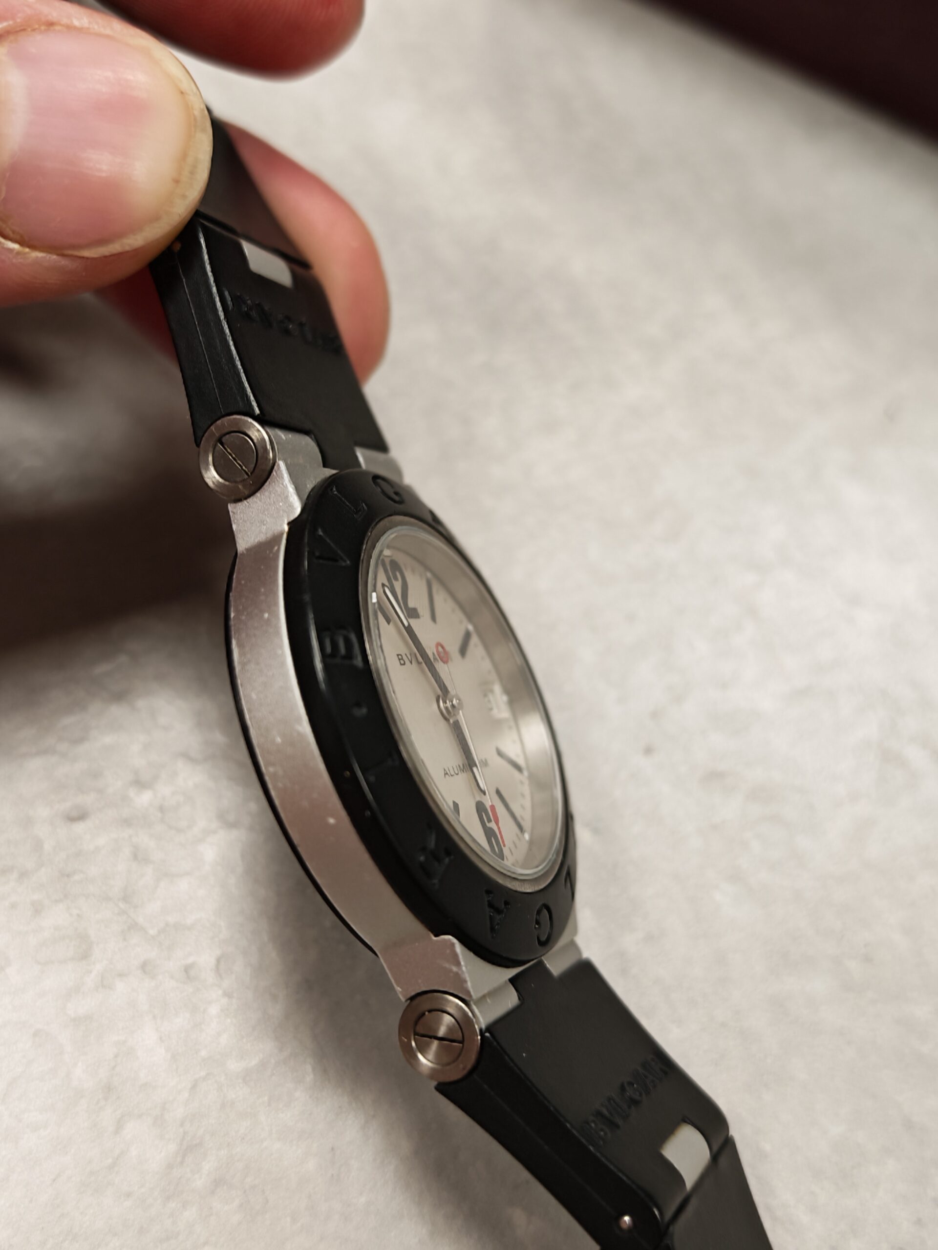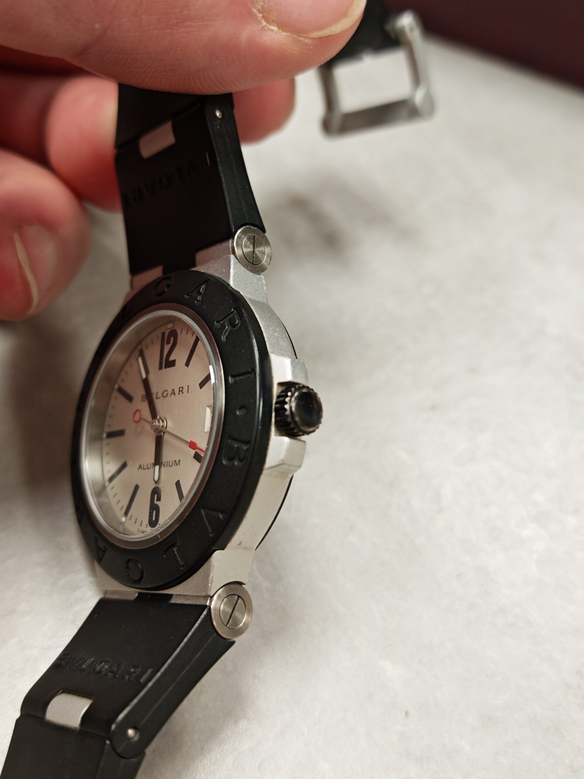 Die Bulgari Diagono AL 38 TA ist eine elegante Herrenarmbanduhr mit einem sportlichen Touch. Das Gehäuse besteht aus leichtem Aluminium mit einer markanten, doppelt gelabelten Gummi-Lünette. Das Zifferblatt ist in Silber gehalten und mit arabischen Ziffern sowie Strichindizes versehen. Eine Datumsanzeige befindet sich bei 3 Uhr. Das Uhrwerk ist ein präzises Automatikwerk.