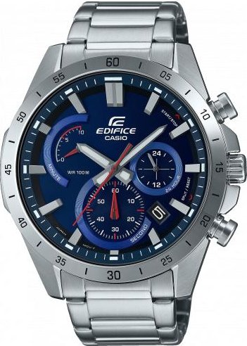 Die Casio Edifice EFR-573D-2AVUEF ist eine sportliche Herrenarmbanduhr mit markantem Design. Sie kombiniert ein robustes Edelstahlgehäuse mit einem blauen Zifferblatt und einem langlebigen Edelstahlarmband. Die Uhr bietet neben einer Datumsanzeige auch eine Stoppuhrfunktion und ist bis zu 10 bar wasserdicht.