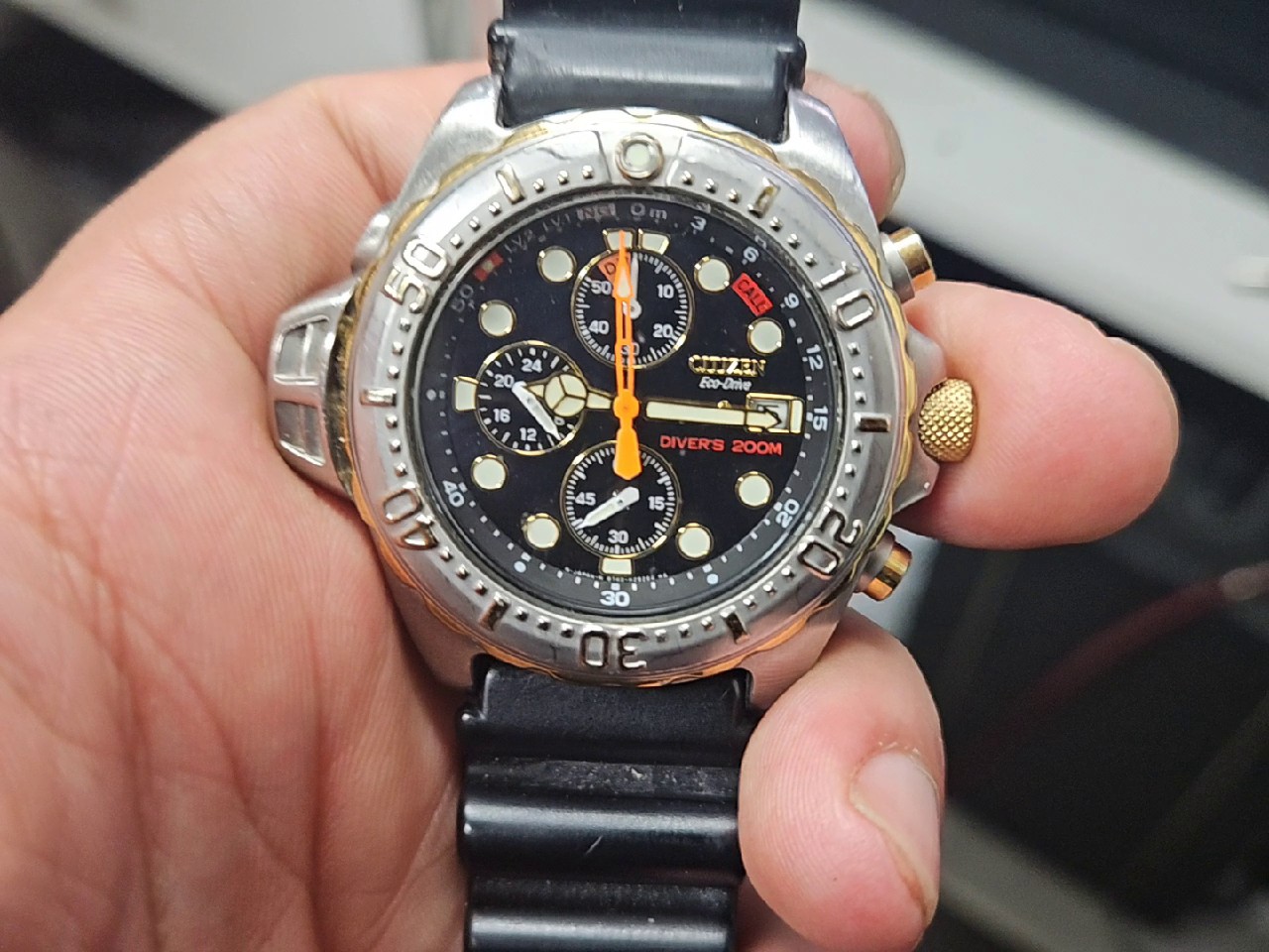 Eco-Drive Solar-Taucheruhr, 200m wasserdicht, Chronograph, Tiefenmesser, Kratzer an Gehäuse