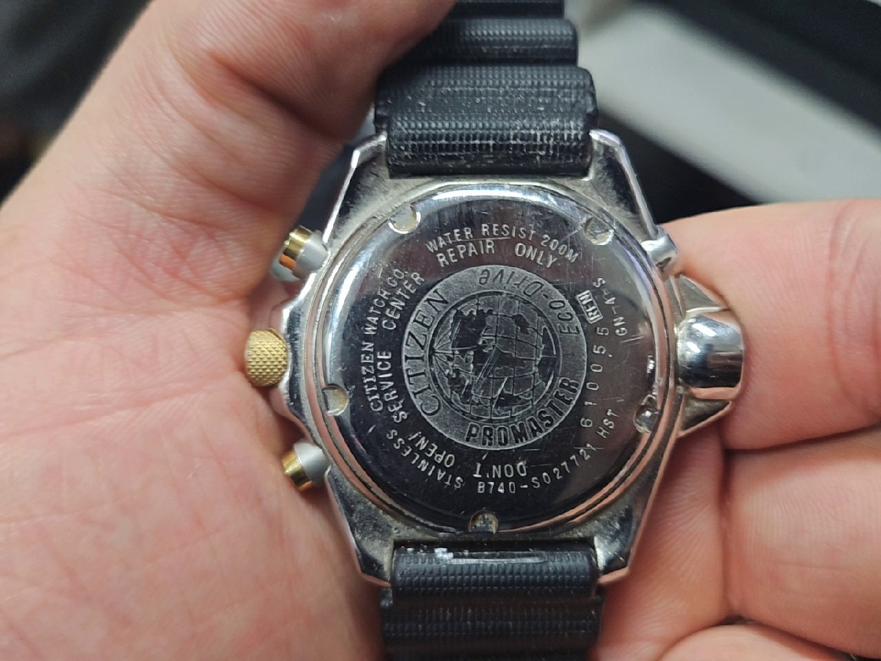 Citizen Promaster Aqualand B740 Chrono, Eco-Drive Solar-Taucheruhr, 200m wasserdicht, Chronograph, Tiefenmesser, Kratzer an Gehäuse | Lünette | Zustand: Gebraucht | Farbe: schwarz