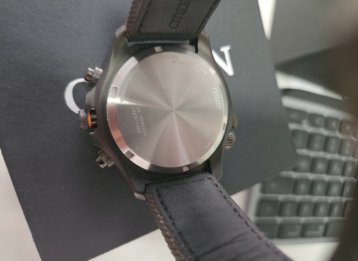 Eco-Drive, Saphirglas, WR 200m, Kompass, Edelstahl, mit OVP und Rechnung, Kratzer am Boden.