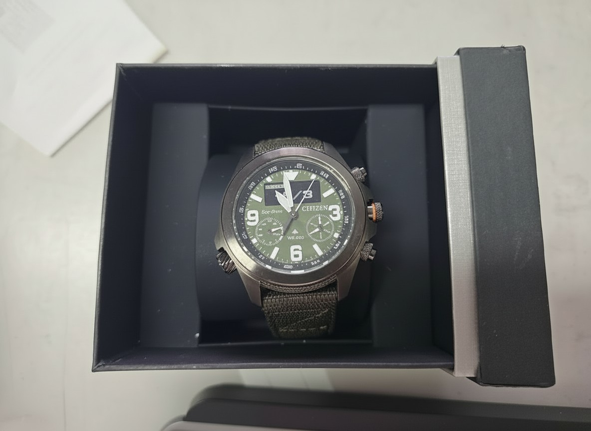 Citizen Promaster Land JV1005-02W, Eco-Drive, Saphirglas, WR 200m, Kompass, Edelstahl, mit OVP und Rechnung, Kratzer am Boden. | Zustand: Sehr Gut | Farbe: grün