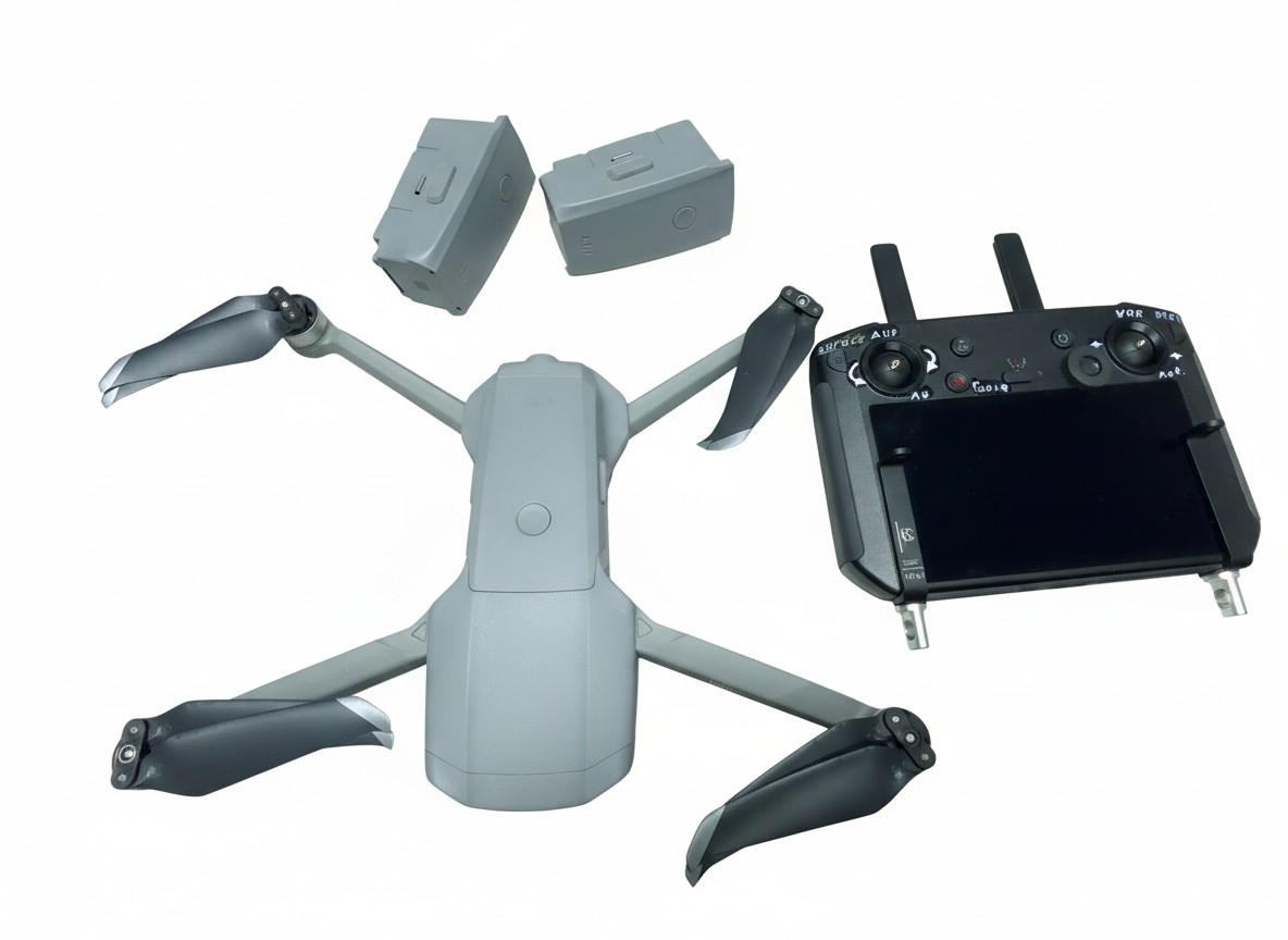 Leistungsstarkes Kameradrohnen-Set in Grau, bestehend aus der DJI Mavic Air 2, dem DJI Smart Controller RM500 für eine intuitive Steuerung mit integriertem Display, zusätzlichen Akkus für längere Flugzeiten und einem passenden Koffer für sicheren Transport. Die Drohne liefert beeindruckende Luftaufnahmen und Videos.