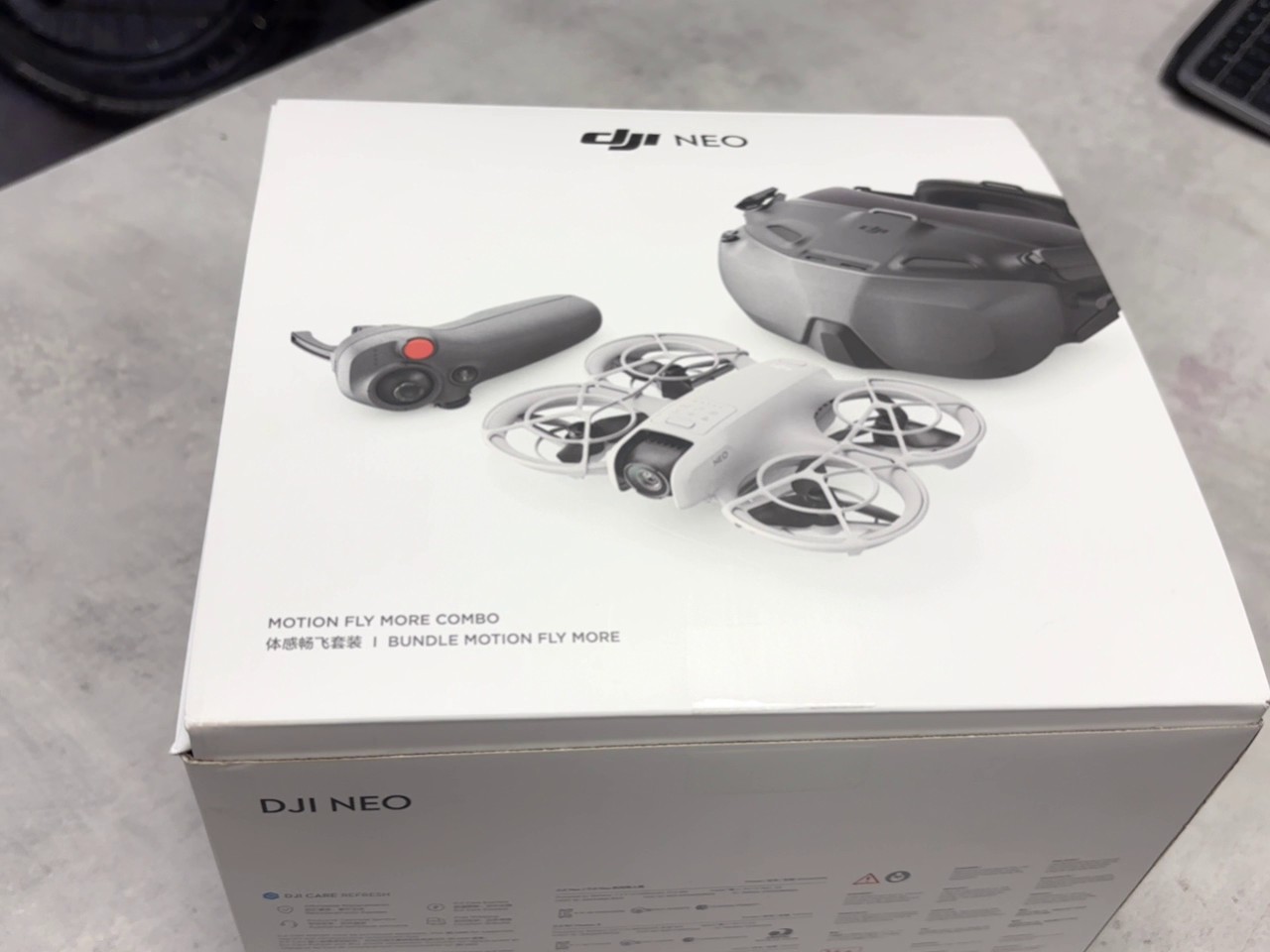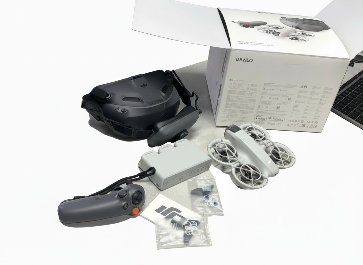Neuwertiges DJI Neo Motion Fly More Combo Set in Hellgrau/Weiß, inklusive DJI Goggles und Motion Controller. Dieses Bundle ermöglicht ein immersives Flugerlebnis und bietet umfangreiche kreative Aufnahmeoptionen. Die Drohne ist extrem leicht und kompakt, ideal für Vlogs und den täglichen Gebrauch.