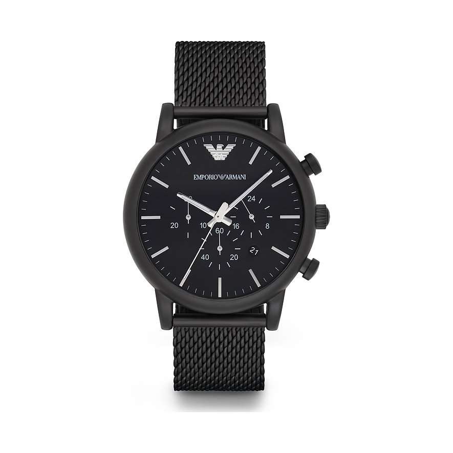 Elegante und sportliche Herren-Chronographenuhr von Emporio Armani mit einem markanten, komplett schwarzen Design. Das Modell AR1968 besticht durch ein schwarz ionenplattiertes Edelstahlgehäuse und ein passendes Edelstahl-Mesh-Armband. Das schwarze Zifferblatt wird durch leuchtende silberfarbene Zeiger und Indizes akzentuiert und beherbergt drei Funktions-Totalisatoren sowie eine Datumsanzeige.