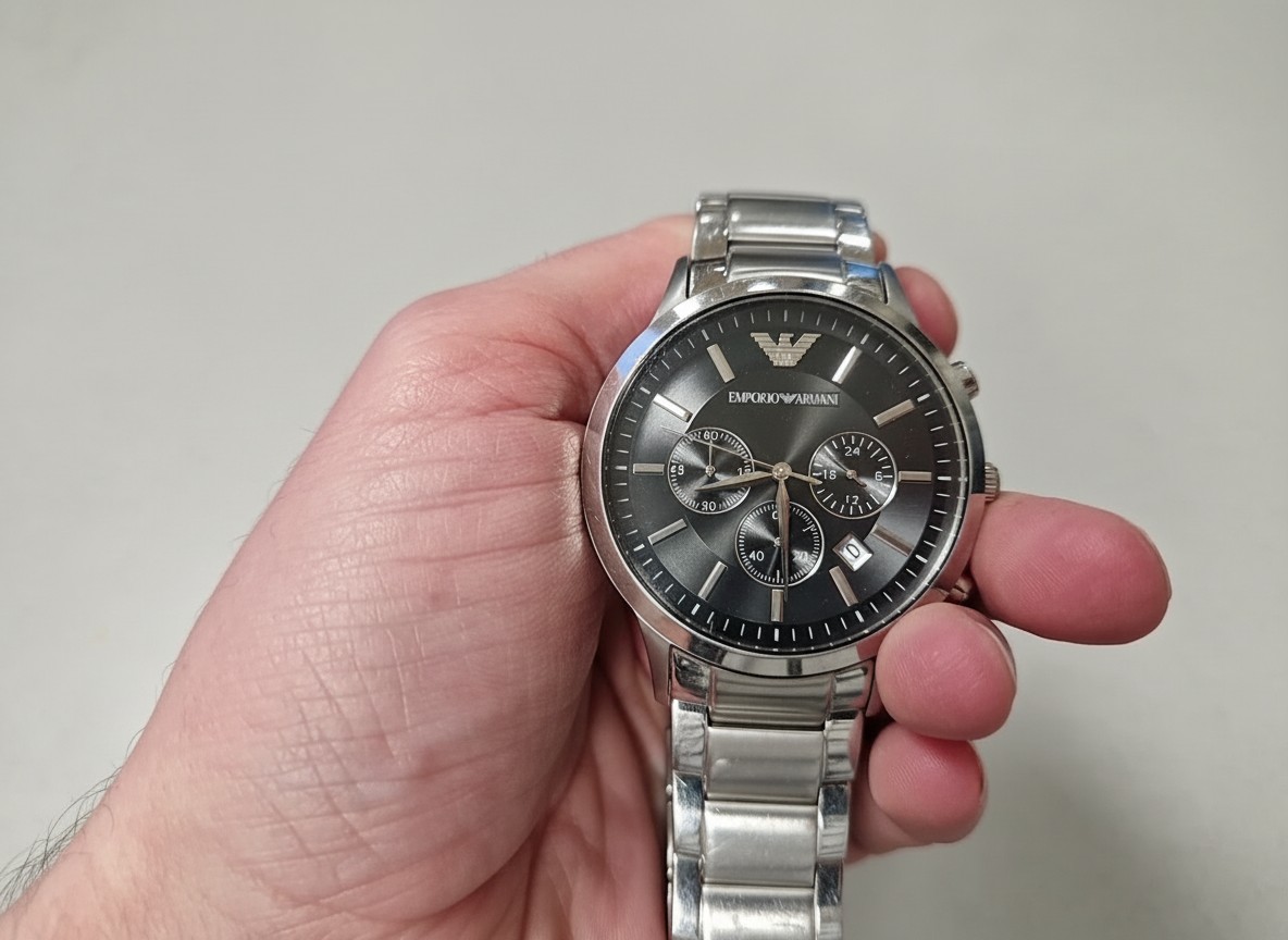 Der Emporio Armani Renato AR2434 Herren-Chronograph besticht durch sein sportlich-elegantes Design mit einem silberfarbenen Edelstahlgehäuse und einem kontrastreichen schwarzen Zifferblatt. Die Uhr der Renato Kollektion kombiniert klassische Ästhetik mit praktischen Funktionen für den modernen Mann.