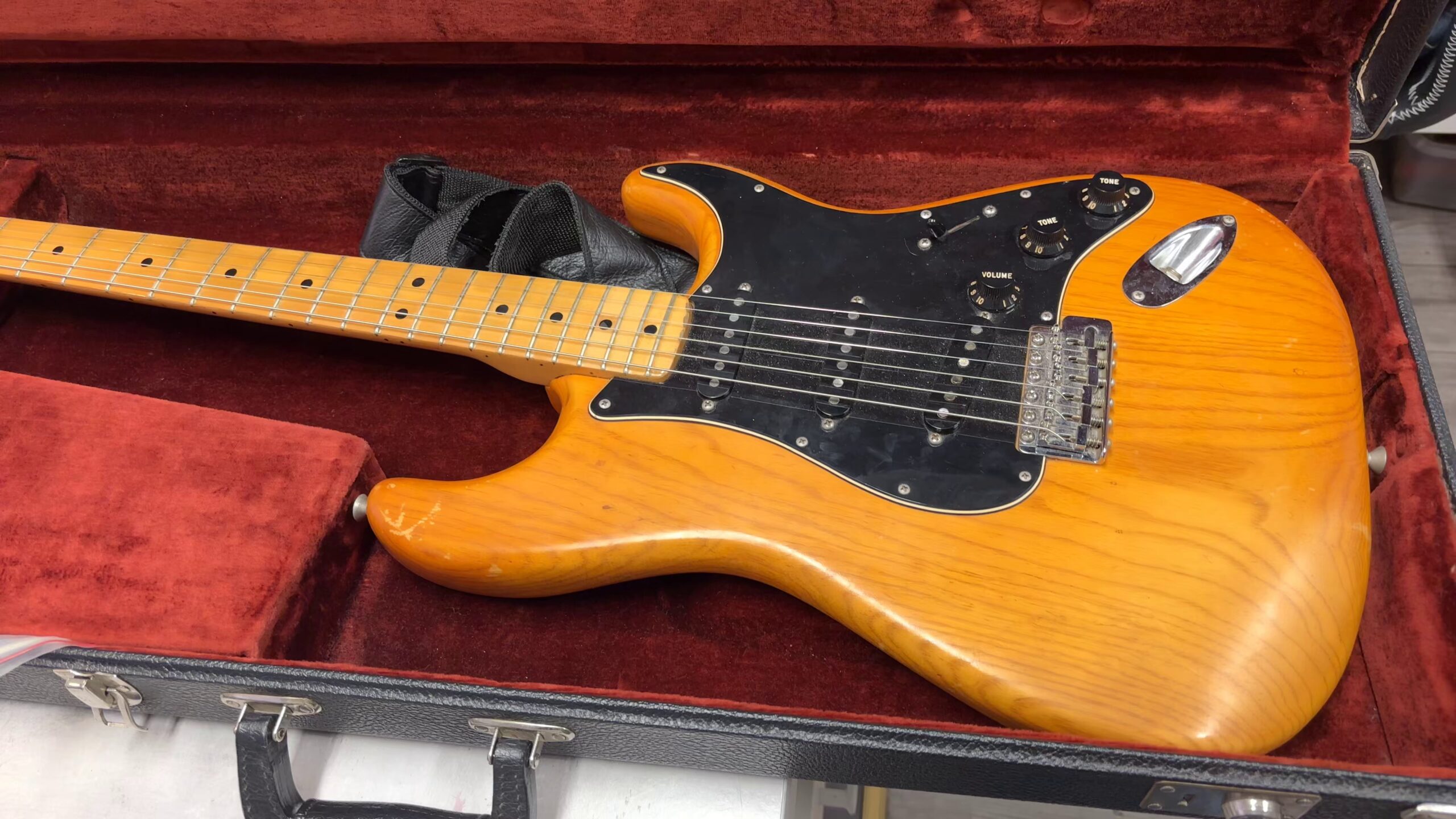 Gebrauchte Fender Stratocaster aus dem Jahr 1976 inklusive Koffer. Diese Vintage-Gitarre aus den 70er Jahren repräsentiert eine spezifische Ära im Fender-Gitarrenbau. Typisch für diese Baujahre sind oft ein Ahornhals (Maple Neck) mit Ahorngriffbrett (Maple Fingerboard) und ein Korpus aus Esche (Ash) oder Erle (Alder). Die Gitarre verfügt über die charakteristische große 70er Jahre Kopfplatte und in der Regel drei Single-Coil-Tonabnehmer.