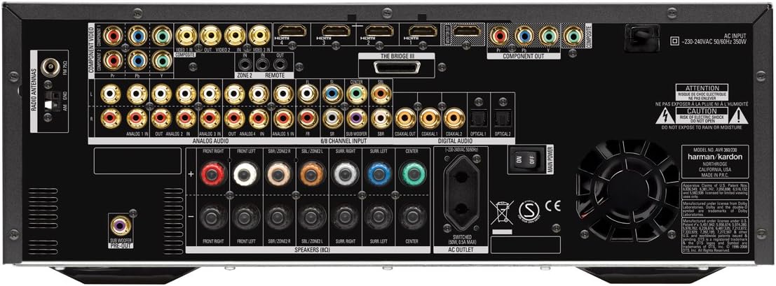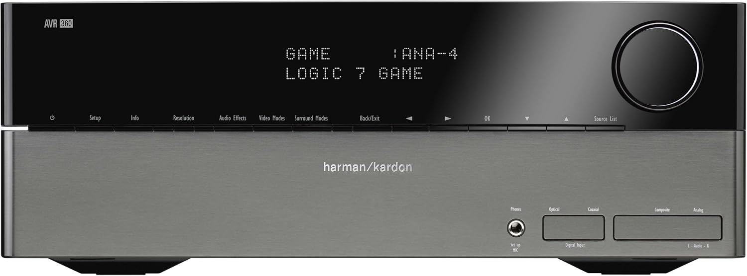 Der Harman Kardon AVR 360 ist ein 7.1-Kanal AV-Receiver in Schwarz, der entwickelt wurde, um hochwertigen Klang mit hochauflösenden Videoquellen zu kombinieren. Er bietet Zugriff auf aktuelle Audiofunktionen wie Dolby TrueHD und DTS-HD Master Audio.