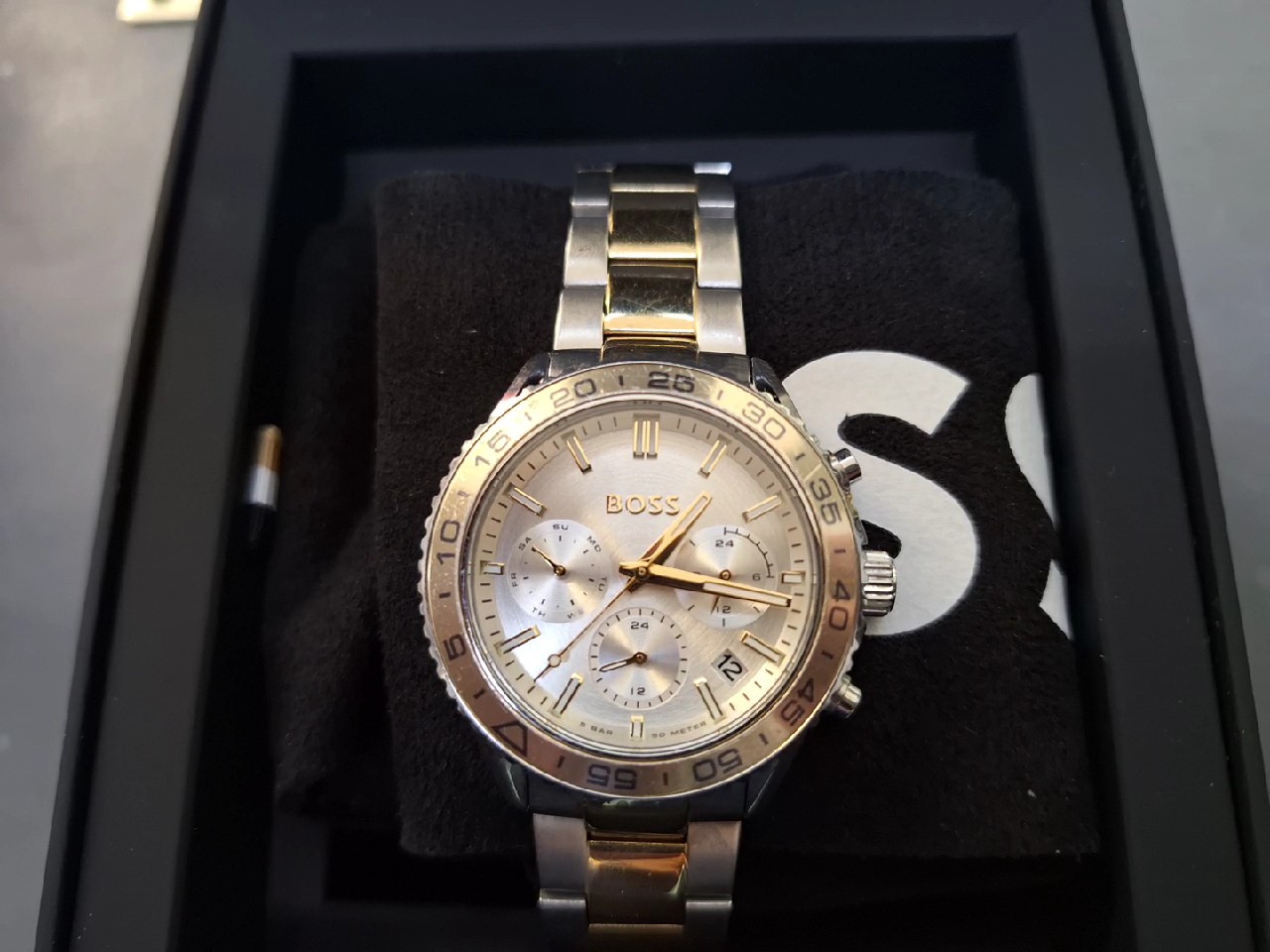 Elegante und stilvolle Hugo Boss Runner For Her Damenuhr (Modell 1502756) im neuwertigen Zustand, präsentiert in einer silber/goldfarbenen Bicolor-Optik. Dieses Quarzwerk-Modell kombiniert modernes Design mit präziser Zeitmessung und ist ein vielseitiges Accessoire für die moderne Frau.
