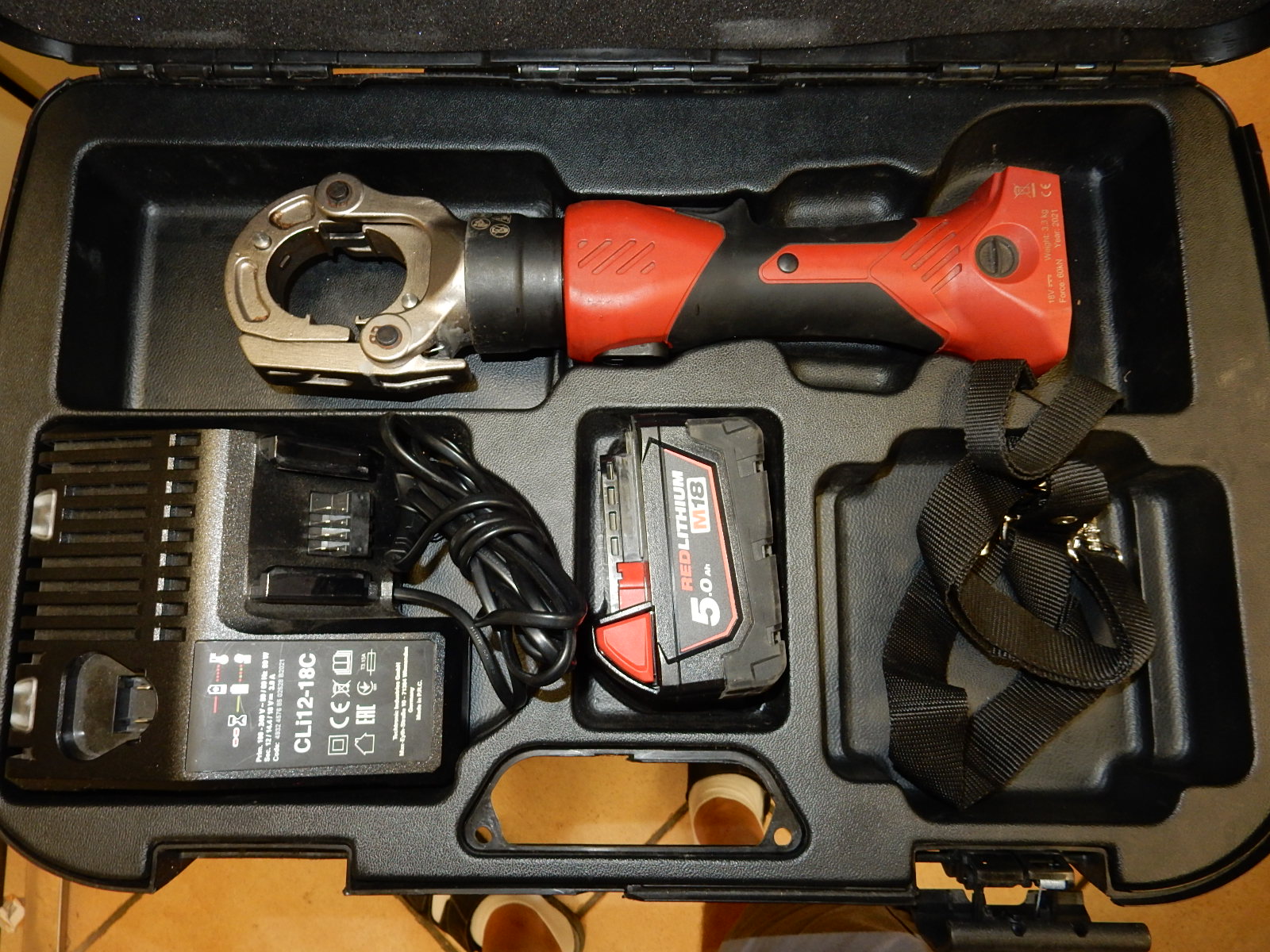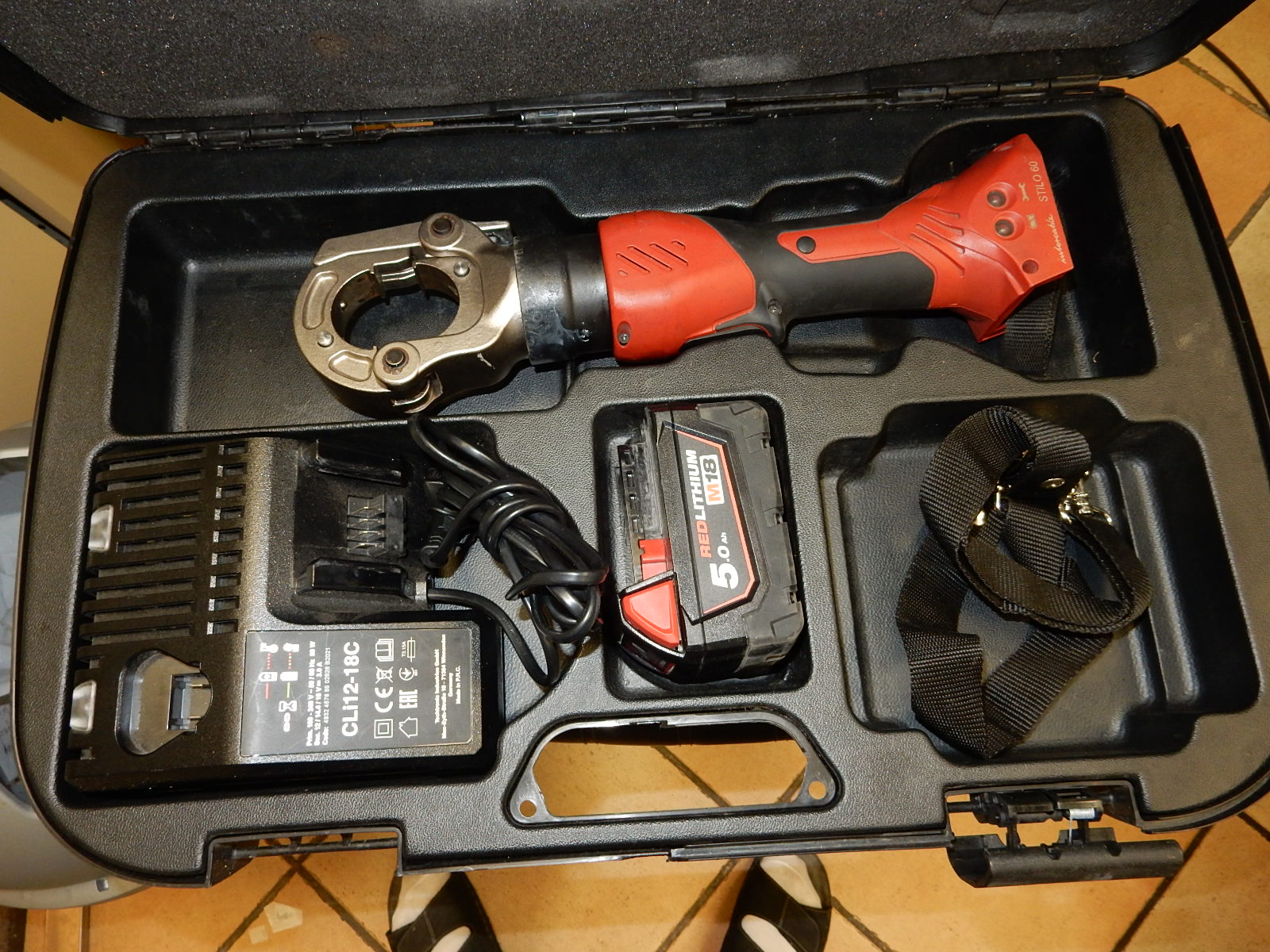 - Lieferumfang: Hydraulische Akku-Presszange, Li-Ionen Akku, Ladegerät, USB-Kabel, Koffer.