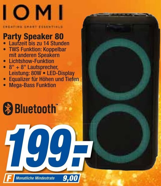 IOMI Party Speaker 80, OVP, 80W, bis 14h Laufzeit, TWS, Lichtshow, Bluetooth | Zustand: Gut