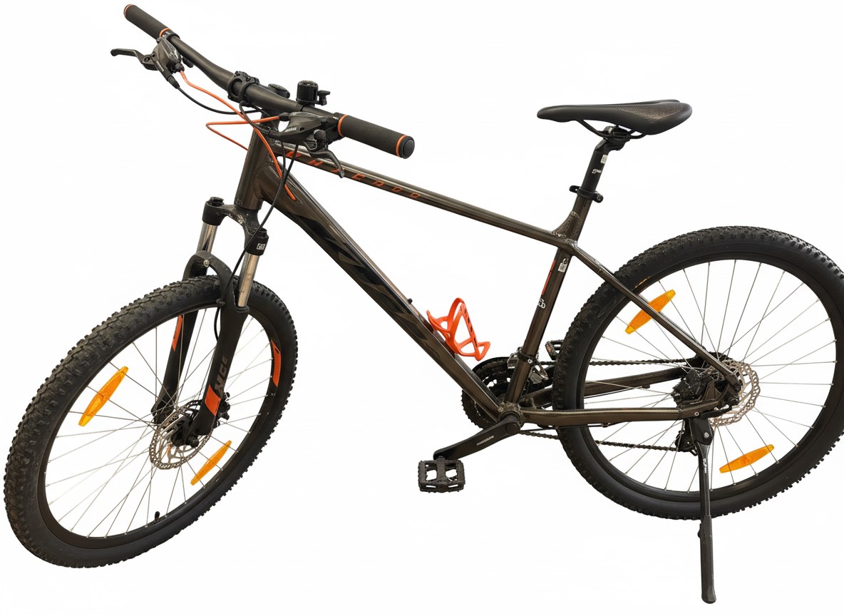Sportliches Hardtail Mountainbike für vielseitige Einsätze, ideal für Gelände und Alltagsfahrten. Das Bike überzeugt mit einem leichten Aluminiumrahmen in dunkelbraun/schwarz mit markanten orangefarbenen Akzenten und bietet dank der Federgabel Komfort auf unebenem Terrain. Ausgestattet mit einer zuverlässigen Shimano Altus Schaltung und hydraulischen Scheibenbremsen für sichere Performance.
