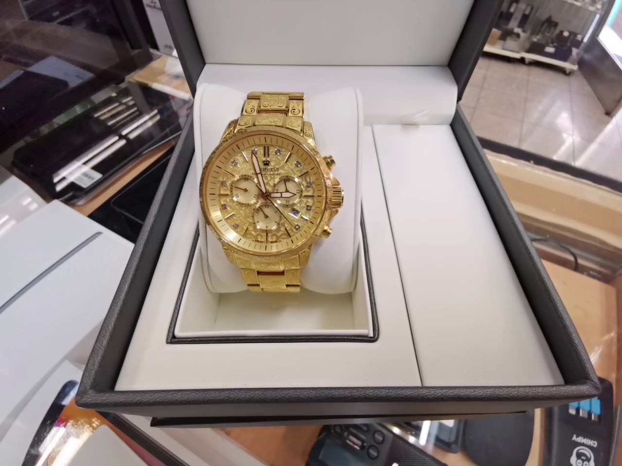 Exklusiver Herren-Chronograph der Marke Louis XVI aus der Palais Royale Kollektion in auffälliger goldfarbener Ausführung, streng limitiert und als Sammlerstück konzipiert. Die Uhr kombiniert königliches Design mit präziser Schweizer Quarz-Technik und wird in der Originalverpackung (OVP) geliefert.
