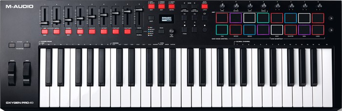 Das M-Audio Oxygen Pro 49 ist ein USB-MIDI-Keyboard mit 49 anschlagdynamischen, halbgewichteten Tasten und Aftertouch. Es bietet umfassende Kontrolle für die Musikproduktion und Performance.