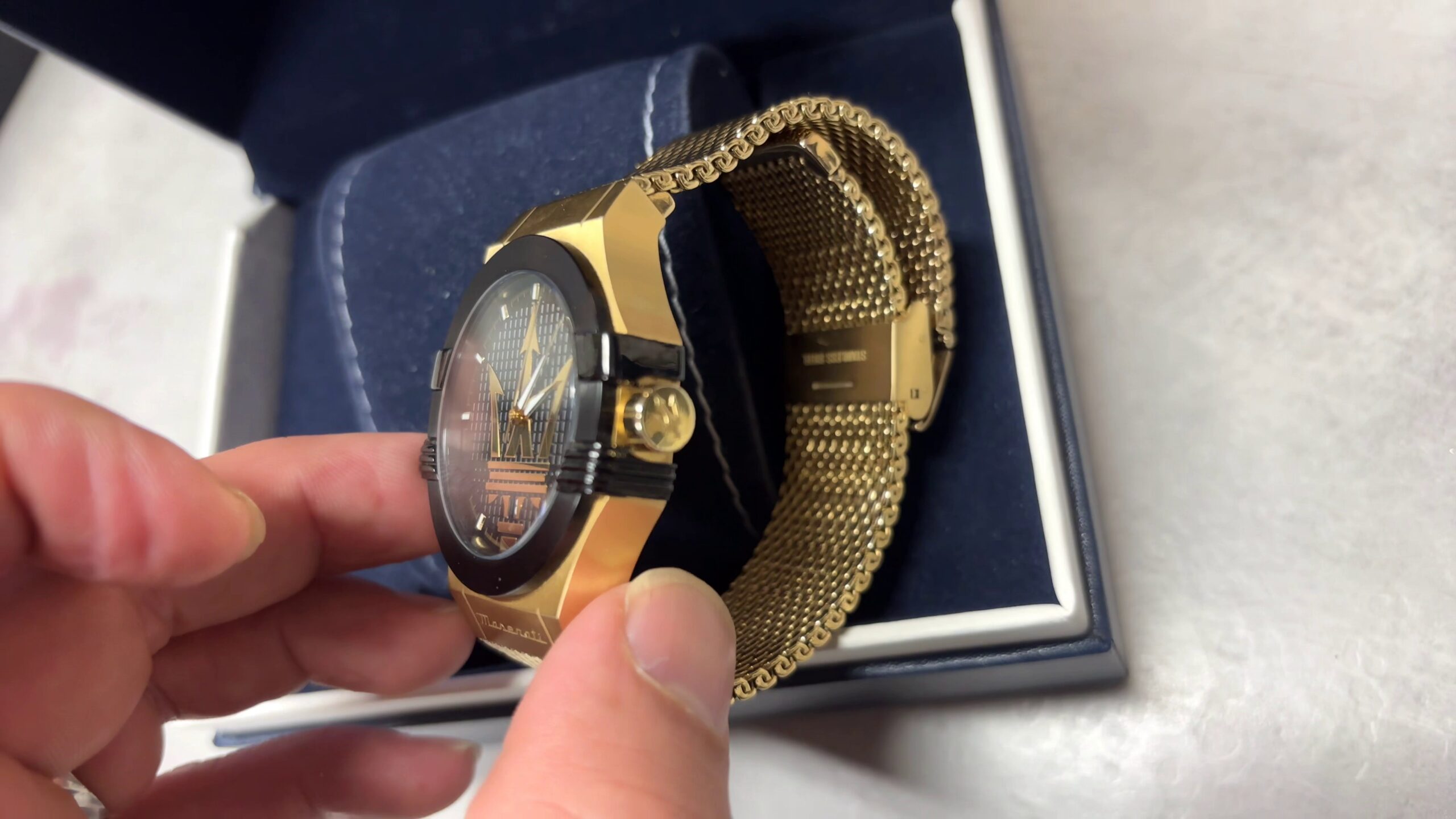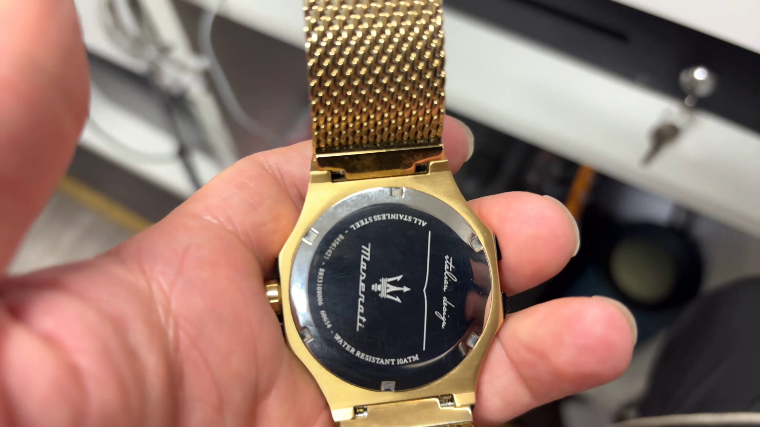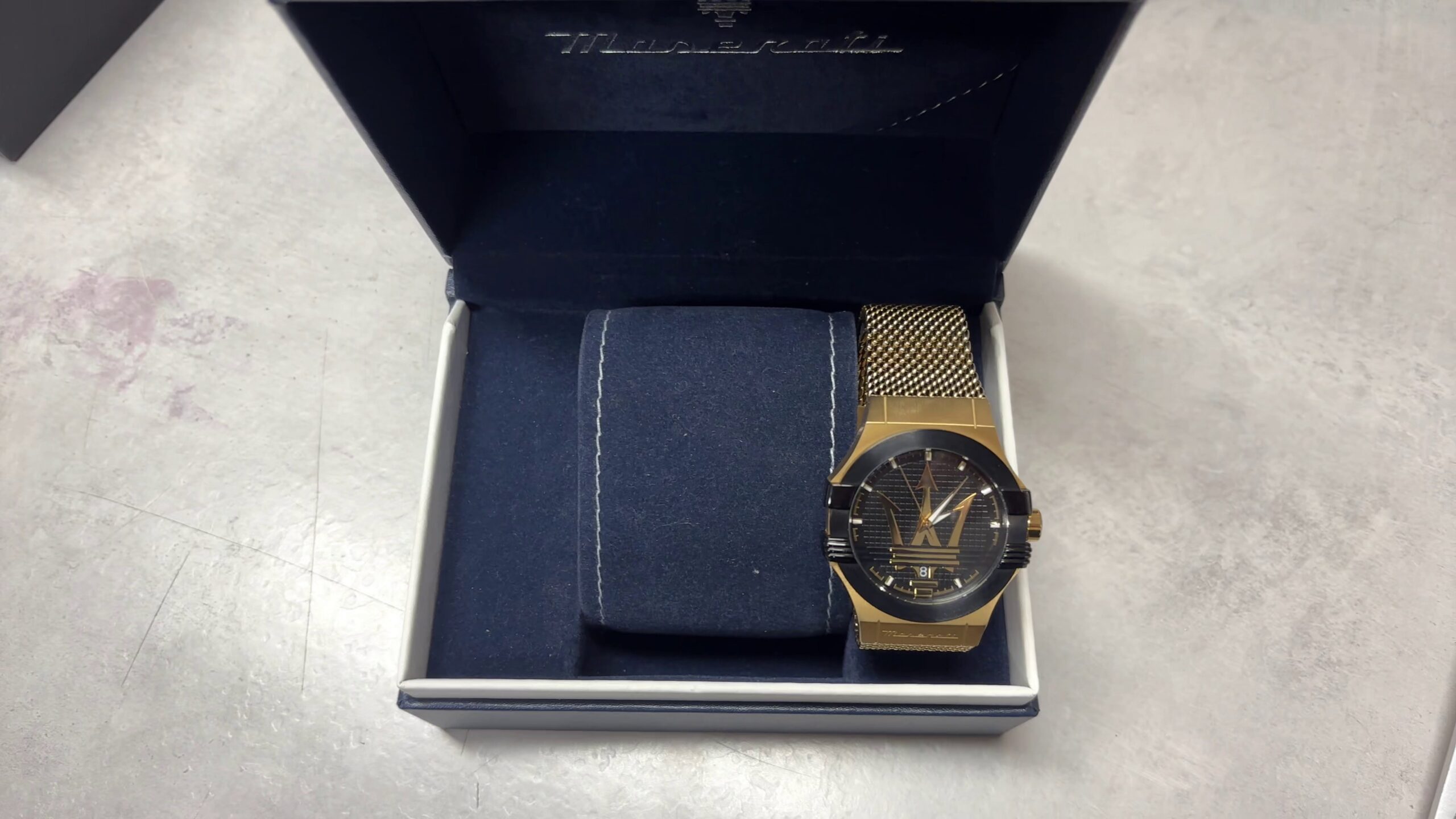 Elegante Herrenuhr der Maserati Potenza Kollektion mit markantem Design und hochwertigen Materialien. Das goldfarbene Milanaiseband bildet einen stilvollen Kontrast zum tiefschwarzen Zifferblatt, was dieser Uhr eine luxuriöse und sportliche Ausstrahlung verleiht.