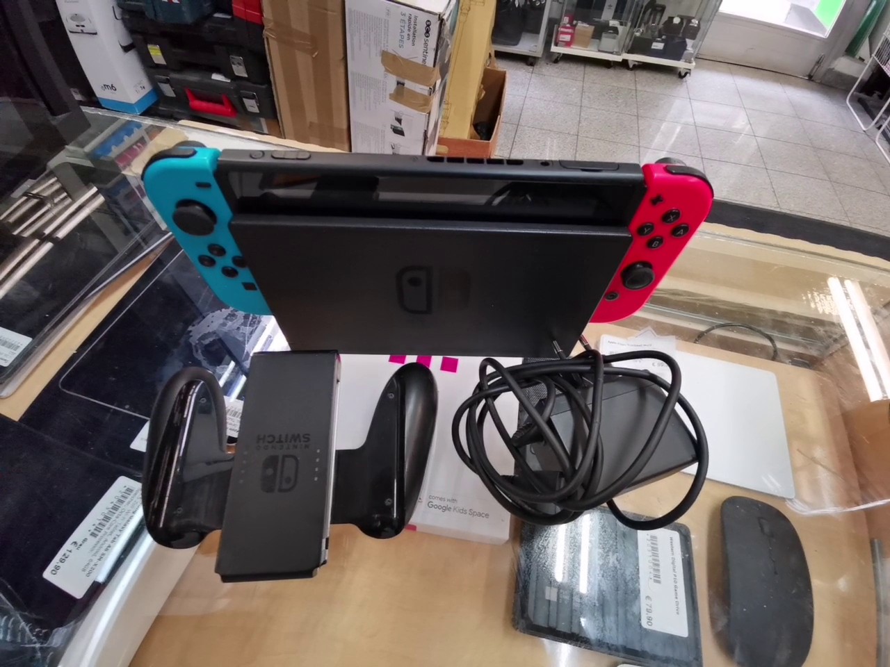 Die Nintendo Switch ist eine innovative Hybrid-Videospielkonsole, die sowohl als stationäre Konsole am Fernseher als auch als tragbares Handheld-Gerät genutzt werden kann. Das System ermöglicht flexibles Spielen an verschiedenen Orten und bietet durch die abnehmbaren Joy-Con-Controller vielfältige Spielmodi, einschließlich Multiplayer direkt an der Konsole. Das mitgelieferte Ladegerät dient zur Stromversorgung und zum Aufladen der Konsole.
