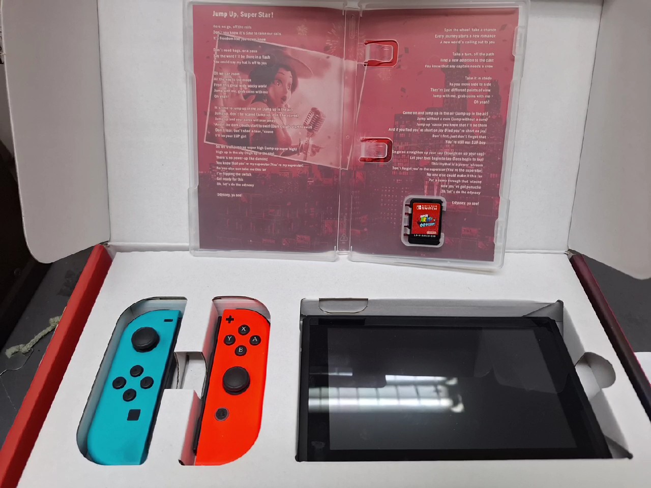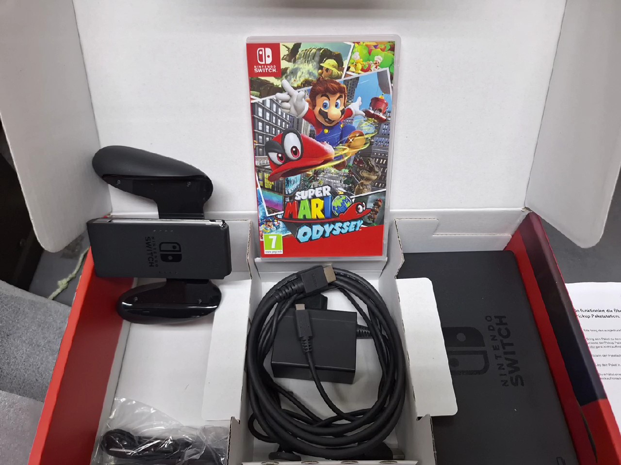 Die Nintendo Switch Konsole im klassischen Design mit den auffälligen Joy-Cons in Neon-Rot und Neon-Blau, inklusive des gefeierten Spiels