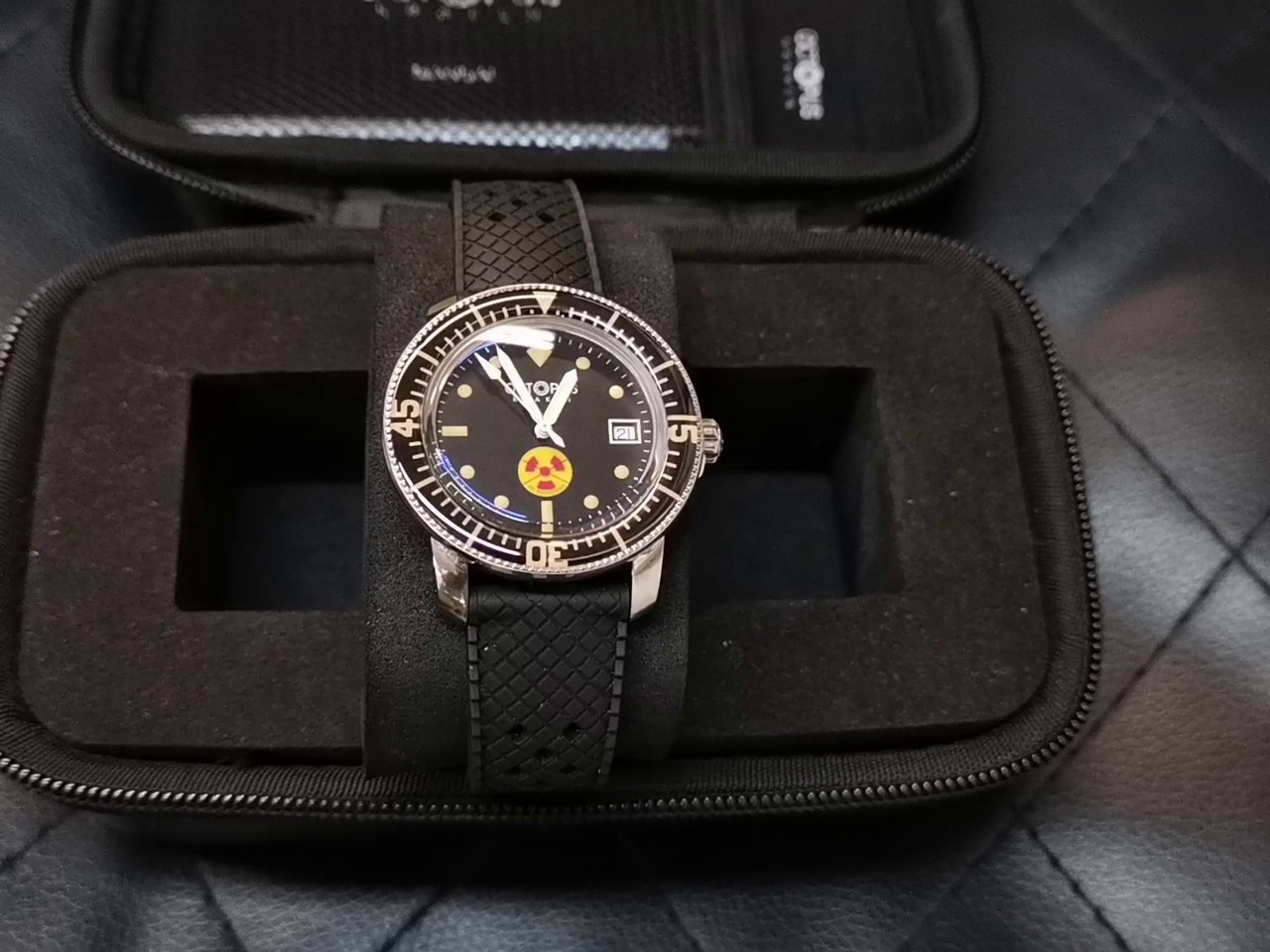 Die Octopus Kraken Automatic Uhr präsentiert sich mit einem markanten schwarzen Zifferblatt, das durch ein auffälliges gelb-rotes Symbol akzentuiert wird. Als mechanische Armbanduhr mit automatischem Aufzug ist sie ein zuverlässiger Begleiter für Sport und Alltag. Die Uhr wird inklusive einer OVP Tasche geliefert.