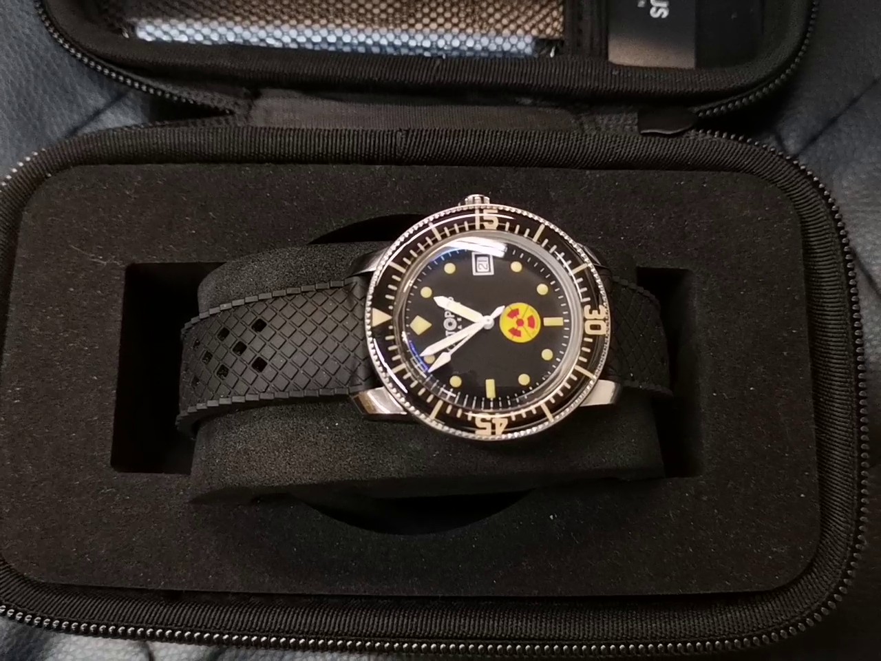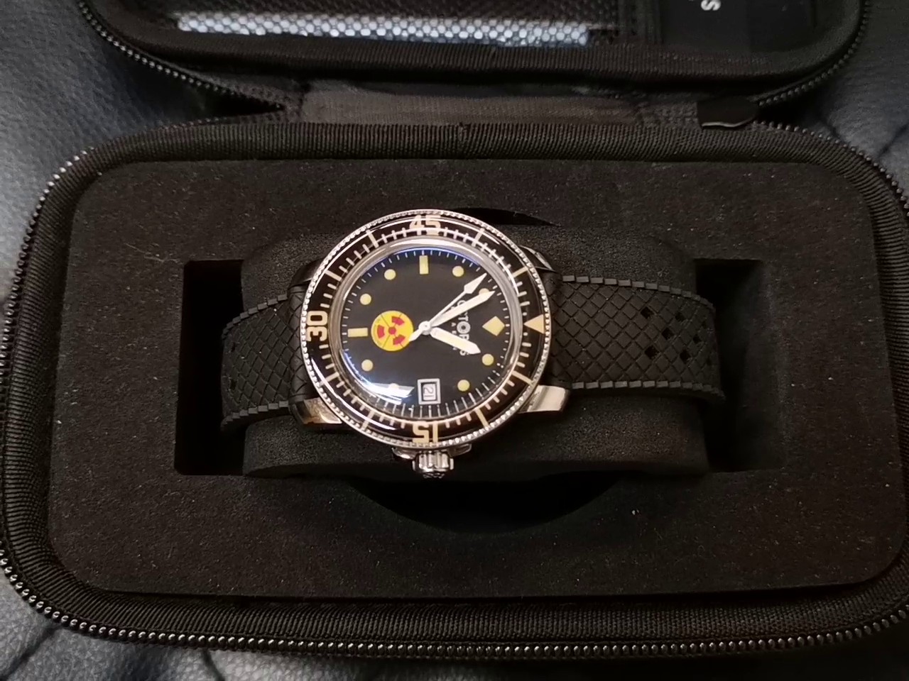- Besonderheit: Gelb-rotes Symbol auf dem Zifferblatt