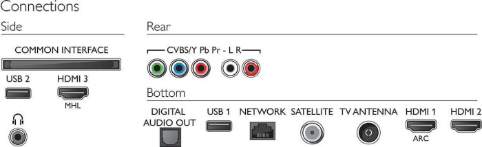 Der Fernseher verfügt über integrierte digitale Tuner für Antenne, Kabel und Satellit. Er unterstützt Streaming-Dienste wie Netflix, YouTube und Amazon Prime Video. Es gibt auch eine Reihe von Anschlussmöglichkeiten, einschließlich HDMI und USB.