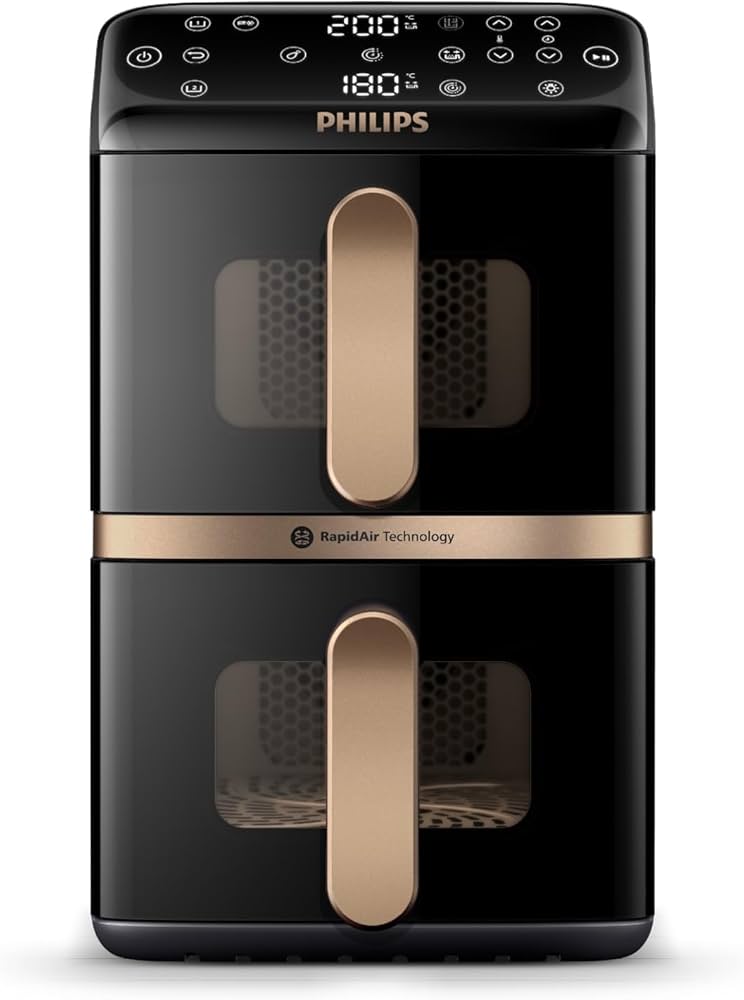 Der Philips Airfryer 4000 Series Dual Basket bietet mit seinem innovativen, vertikal gestapelten Design eine Gesamtkapazität von 10 Litern bei gleichzeitig platzsparender Stellfläche. Dank der RapidAir Technologie und zwei unabhängigen 5-Liter-Körben lassen sich zwei verschiedene Gerichte zeitgleich perfekt zubereiten. Das Gerät ist ideal für Familien geeignet, die Wert auf effizientes, knuspriges und gesundes Kochen mit weniger Fett legen.