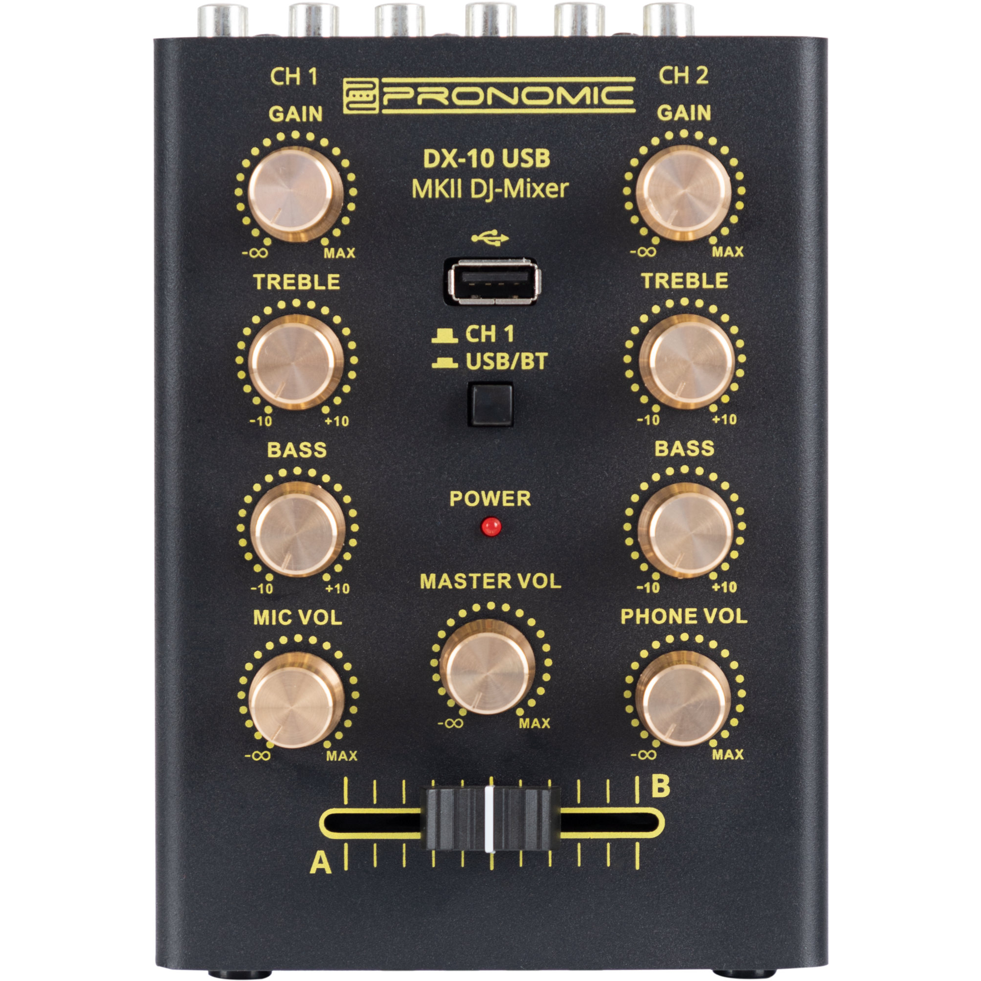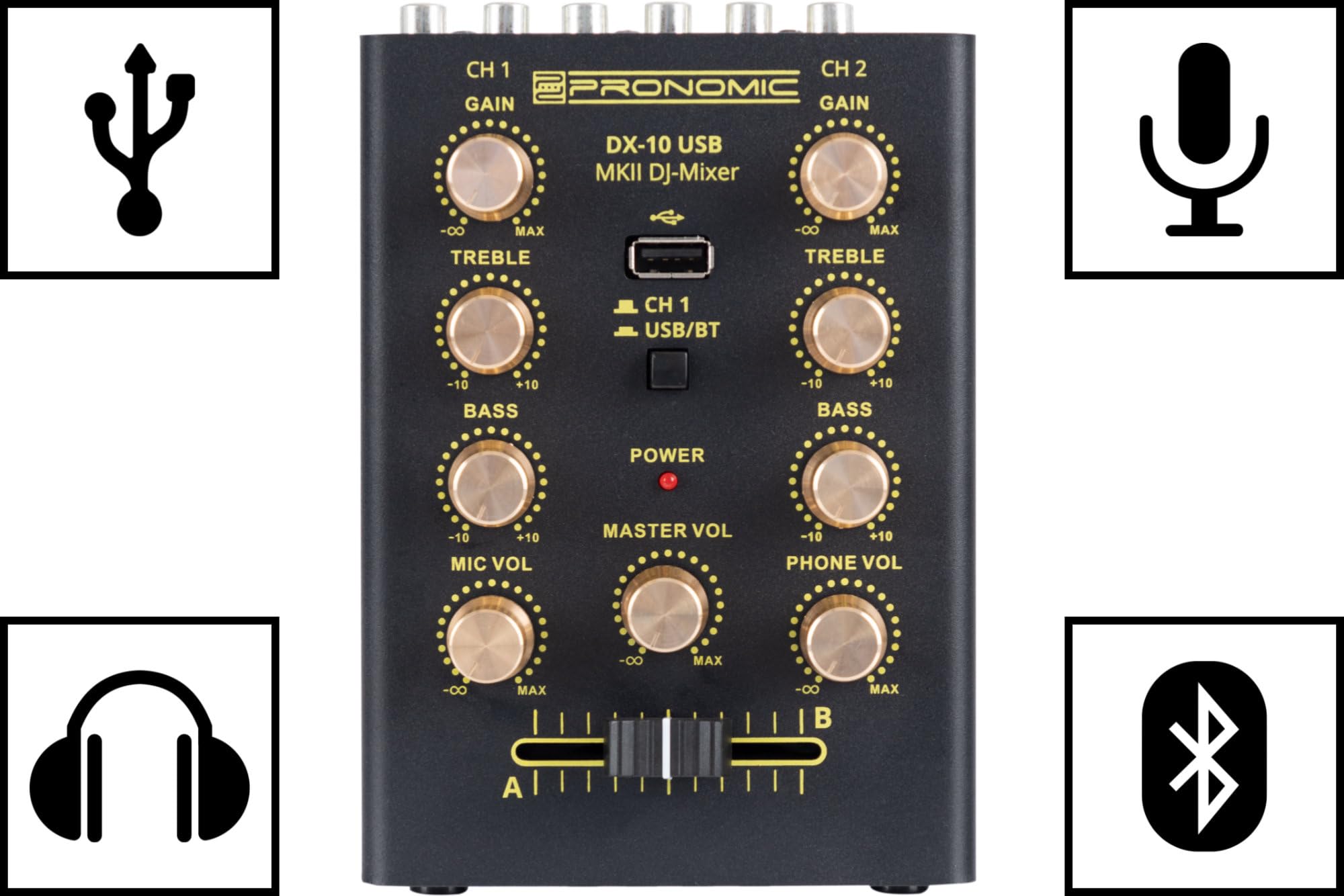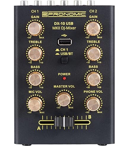 Der Pronomic DX-10 USB MKII ist ein kompakter 2-Kanal DJ-Mixer mit robuster Metallkonstruktion. Er verfügt über zwei Line-Eingänge mit 2-Band Equalizer pro Kanal. Eine Bluetooth-Schnittstelle und ein USB-Player ermöglichen das Abspielen von Musikdateien. Der Mixer besitzt einen Mikrofoneingang mit separatem Lautstärkeregler sowie einen Master- und Kopfhörerausgang. Ein leichtgängiger 45mm Crossfader sorgt für nahtlose Übergänge.