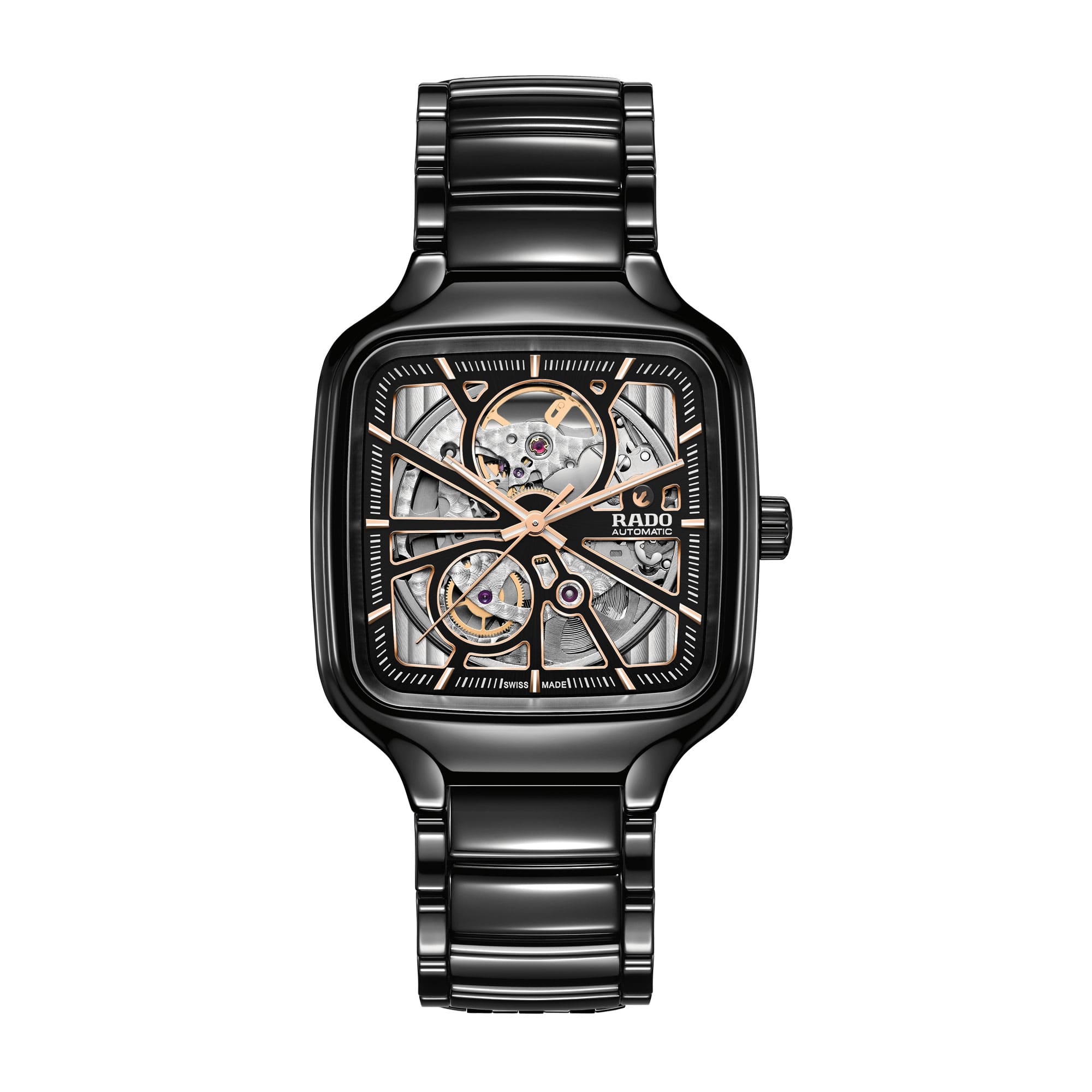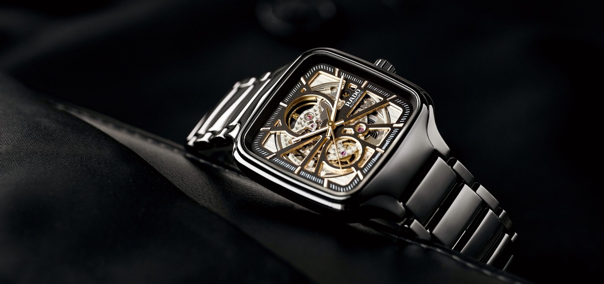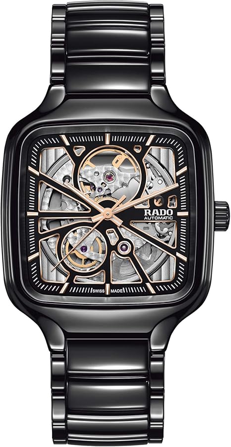 Die Rado True Square Automatic Open Heart vereint ikonisches Design mit innovativer Materialtechnologie. Das markante, quadratische Monobloc-Gehäuse sowie das Armband sind aus kratzfester, schwarzer High-Tech-Keramik gefertigt, die für außergewöhnlichen Tragekomfort und Langlebigkeit sorgt. Das skelettierte Zifferblatt gewährt einen faszinierenden Einblick in das präzise Automatikwerk und unterstreicht den modernen, technisch anspruchsvollen Charakter dieser Uhr.