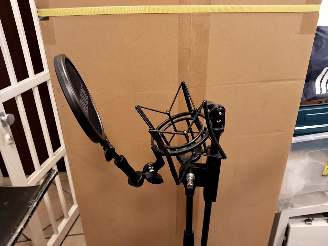 Elastische Mikrofonhalterung mit abnehmbarem Pop-Schutz auf einem schwarzen Mikrofonstativ.