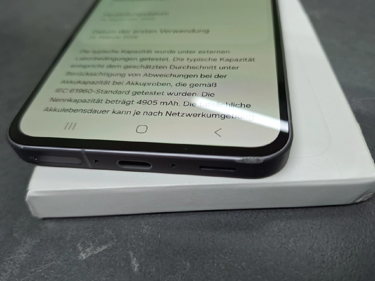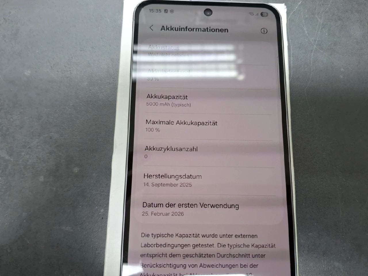 Gebrauchtes Samsung Galaxy A56 5G mit 256GB Speicherplatz, das sich in einem neuwertigen Zustand befindet, da es erst am 25.02.2026 erstgenutzt wurde und 0 Ladezyklen aufweist. Das Display ist kratzerfrei, während das Gehäuse leichte Gebrauchsspuren zeigt.