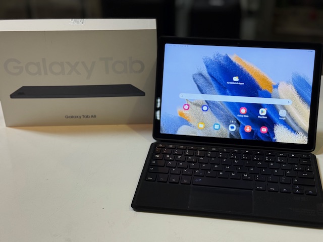 Das Samsung Galaxy Tab A8 ist ein vielseitiges Tablet mit einem schlanken Design und solider Leistung für den täglichen Gebrauch. Es wird mit einer Originalverpackung und einer Hülle mit Tastatur geliefert, was es ideal für Produktivität und Unterhaltung macht.