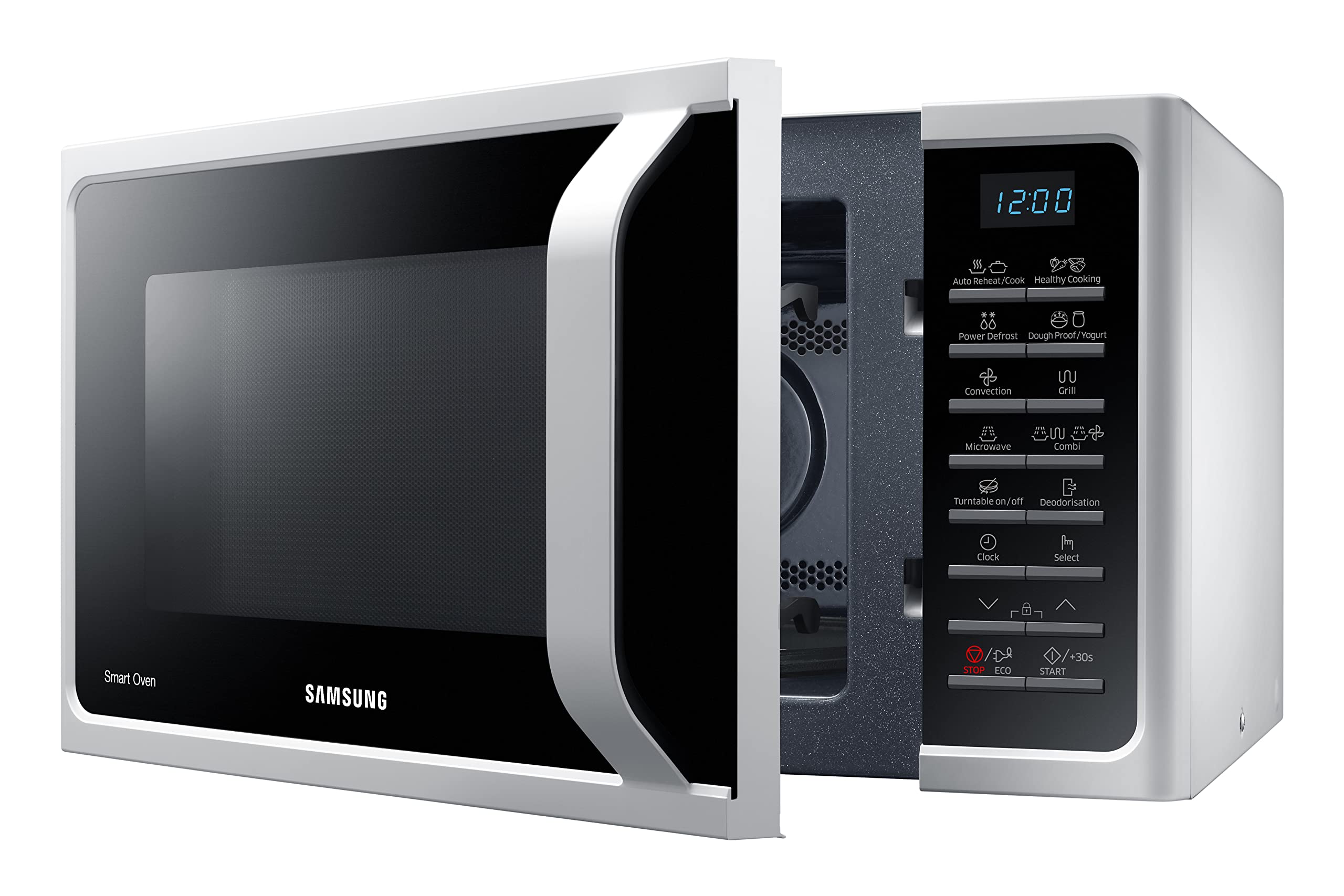 Die Samsung MC28H5015AW ist eine vielseitige Kombi-Mikrowelle in elegantem Weiß, die Mikrowellenfunktion, Grill und Heißluft in einem Gerät vereint. Mit einem Garraumvolumen von 28 Litern und einer robusten, leicht zu reinigenden Keramik-Emaille-Beschichtung bietet sie ideale Voraussetzungen für die Zubereitung abwechslungsreicher Gerichte. Dank der praktischen Heißluftfunktion und zahlreicher Automatikprogramme gelingen Aufläufe, Gebäck und gegrillte Speisen mühelos.