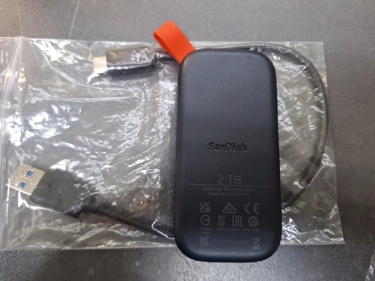 Die SanDisk Portable SSD mit 2 TB Speicherplatz bietet eine kompakte und zuverlässige Lösung für den mobilen Datentransfer. Mit schnellen Lesegeschwindigkeiten von bis zu 800 MB/s und einer robusten Bauweise, die Stürze aus bis zu zwei Metern Höhe übersteht, ist sie der ideale Begleiter für unterwegs. Dank des praktischen Gummibügels lässt sie sich zudem sicher an Rucksäcken oder Taschen befestigen.