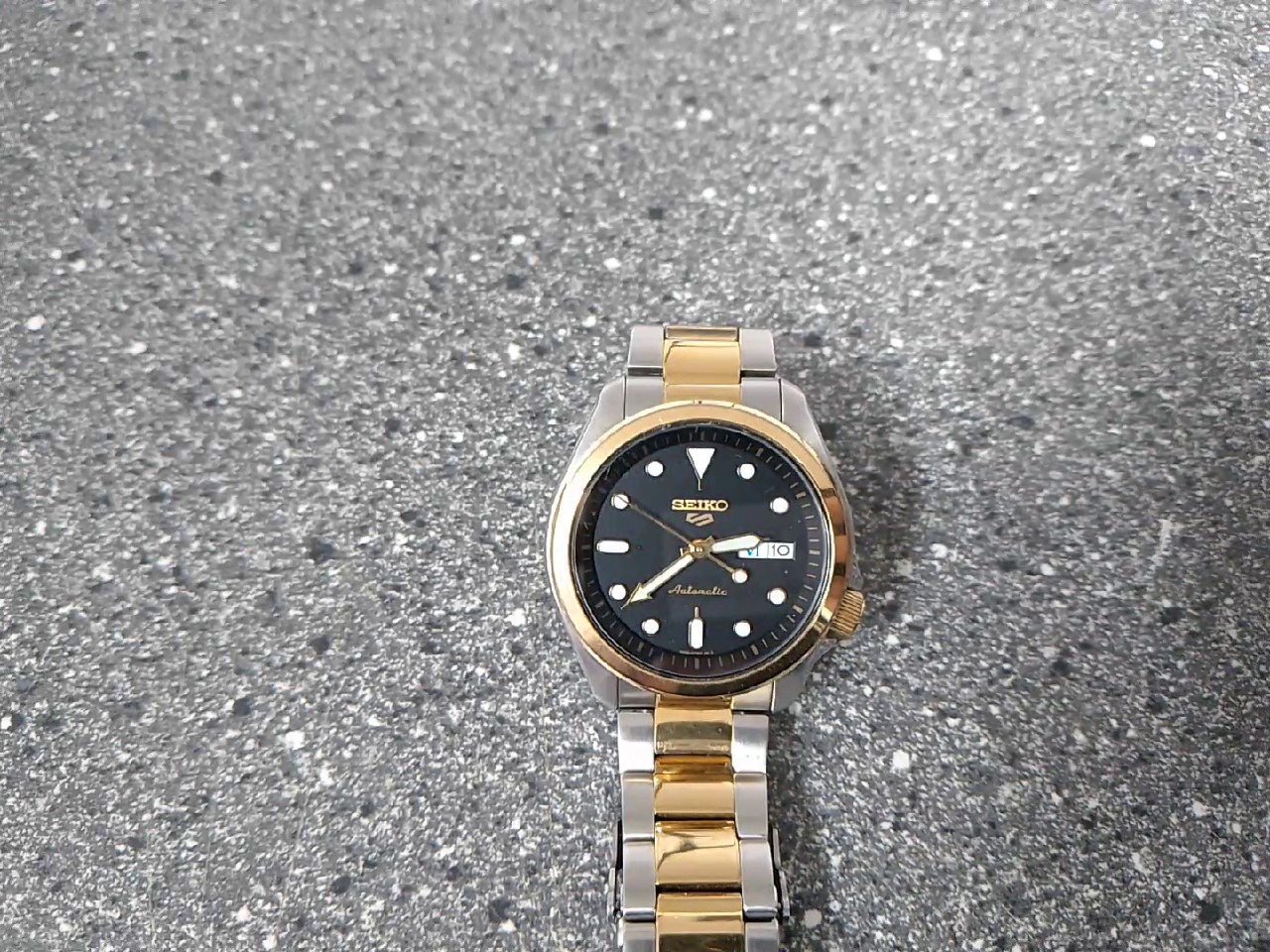 Die Seiko 5 Automatic Two-Tone Uhr kombiniert klassisches Design mit der Zuverlässigkeit eines mechanischen Automatikwerks. Das Modell verfügt über ein markantes schwarzes Zifferblatt, das durch silberfarbene und goldfarbene Akzente (Two-Tone) am Gehäuse und/oder Armband ergänzt wird. Die Uhr zeigt zuverlässig Tag und Datum an und ist ein robustes, alltagstaugliches Zeitmessinstrument.