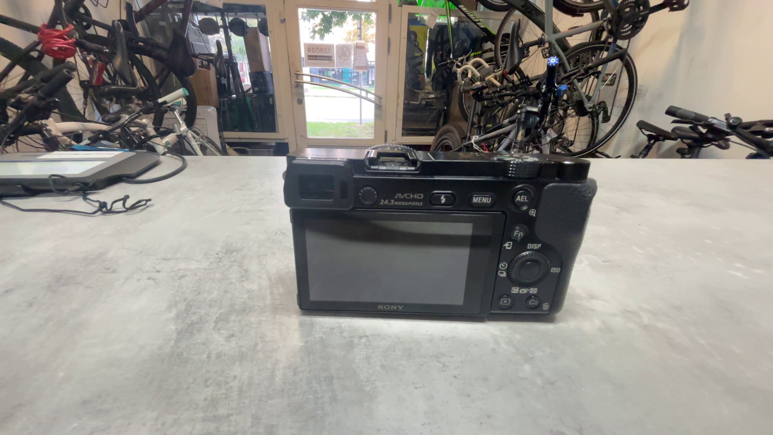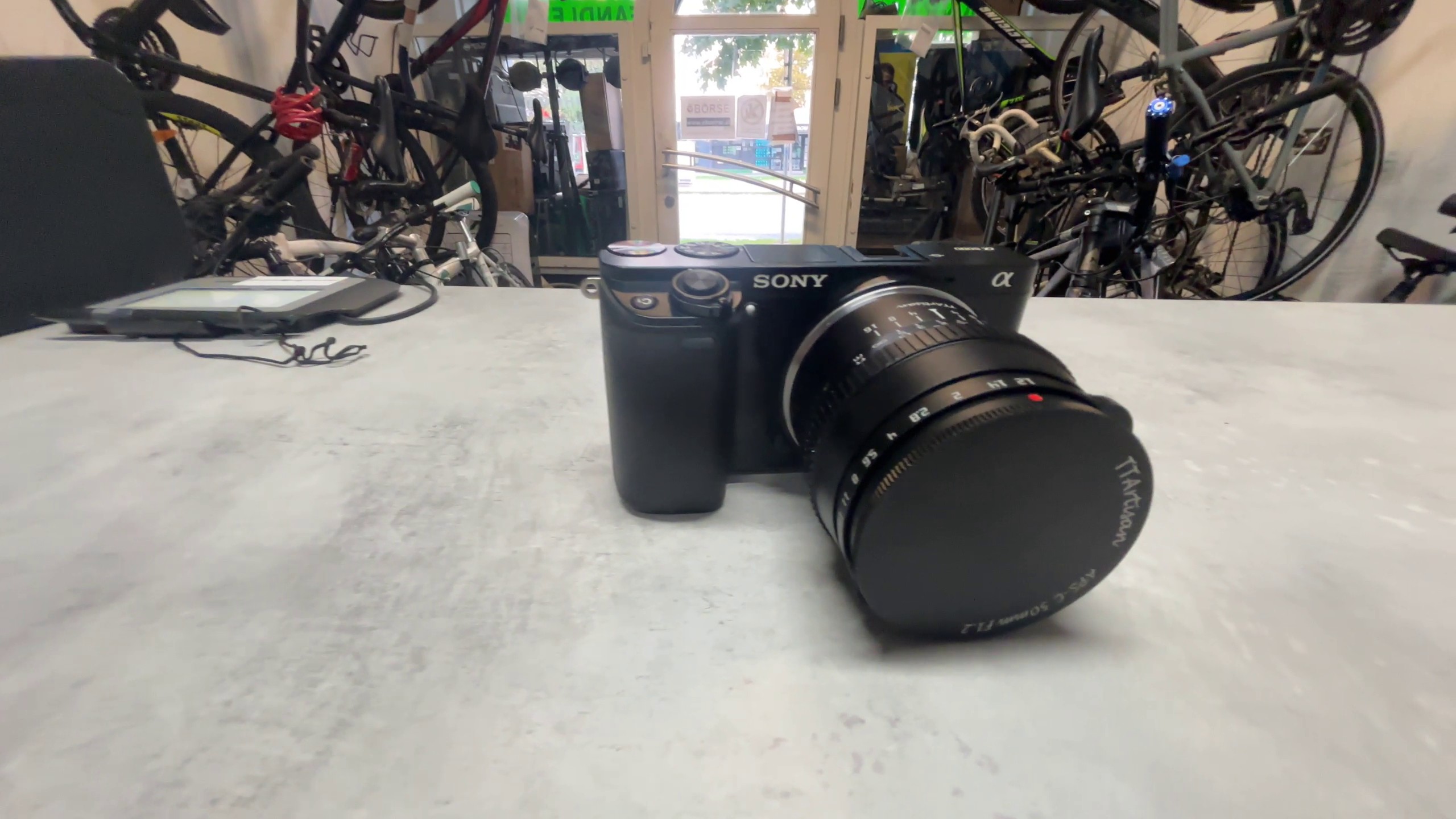 Hier ist eine aktualisierte, kurze Beschreibung der Sony A6000 Kamera mit dem TTArtisan 50mm f1.2 Objektiv, unter Berücksichtigung der Display-Kratzer und des zusätzlichen Akkus: