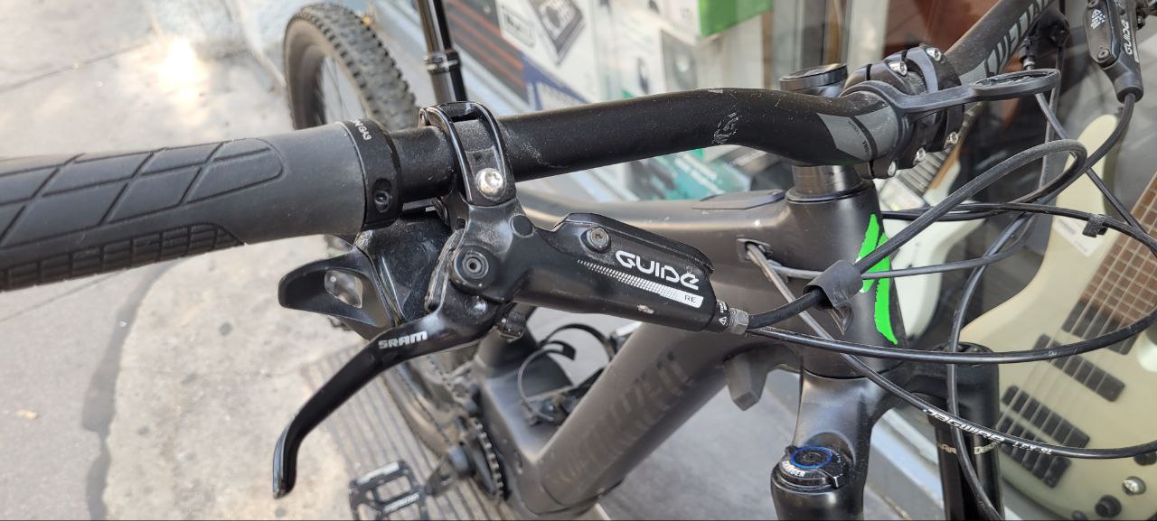 - Bremsen: SRAM Code R, 4-Kolben, hydraulische Scheibenbremsen mit 200mm Scheiben.